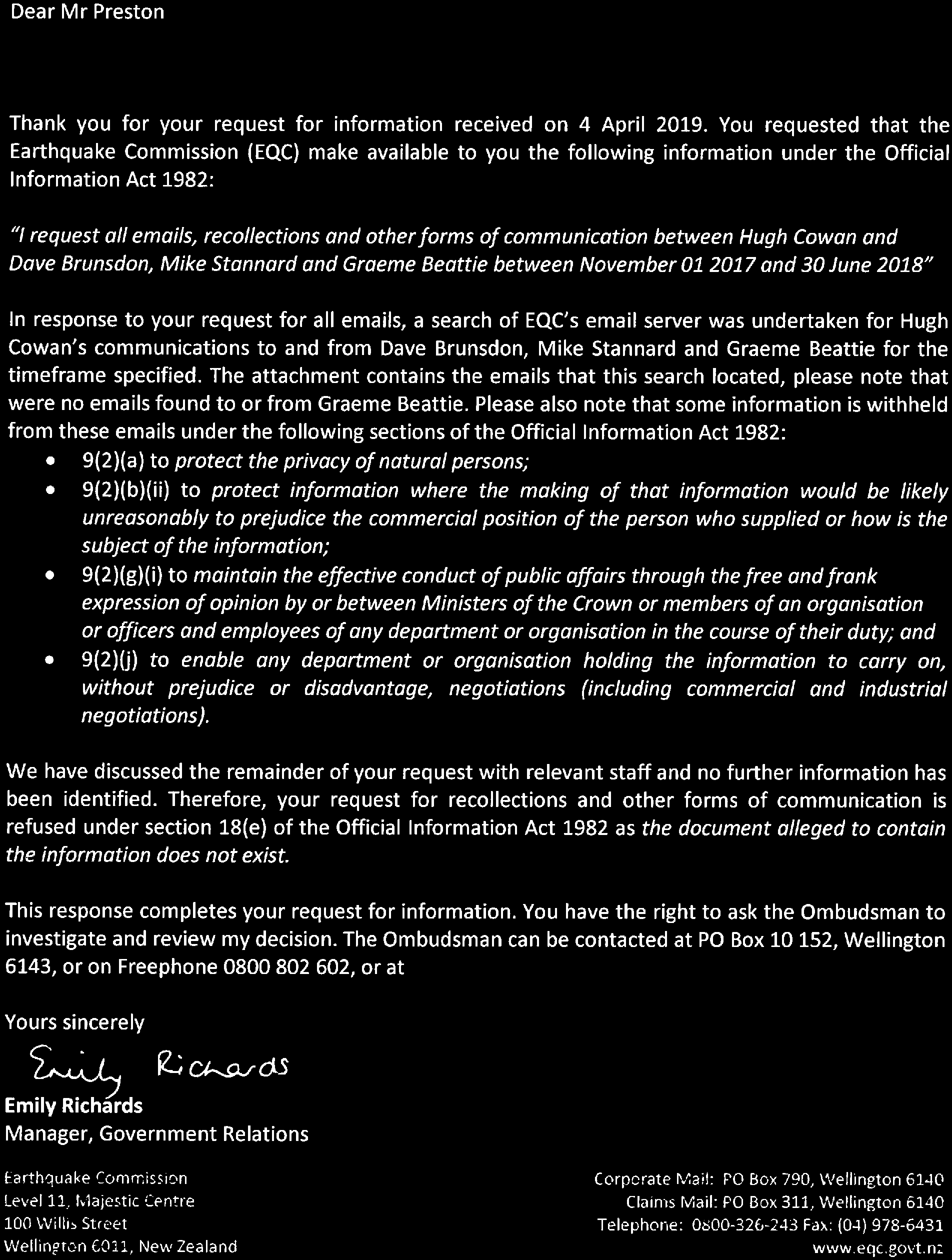 Communication between Hugh Cowan and Dave Brunsdon, Mike Stannard and Graeme Beattie from November 2017