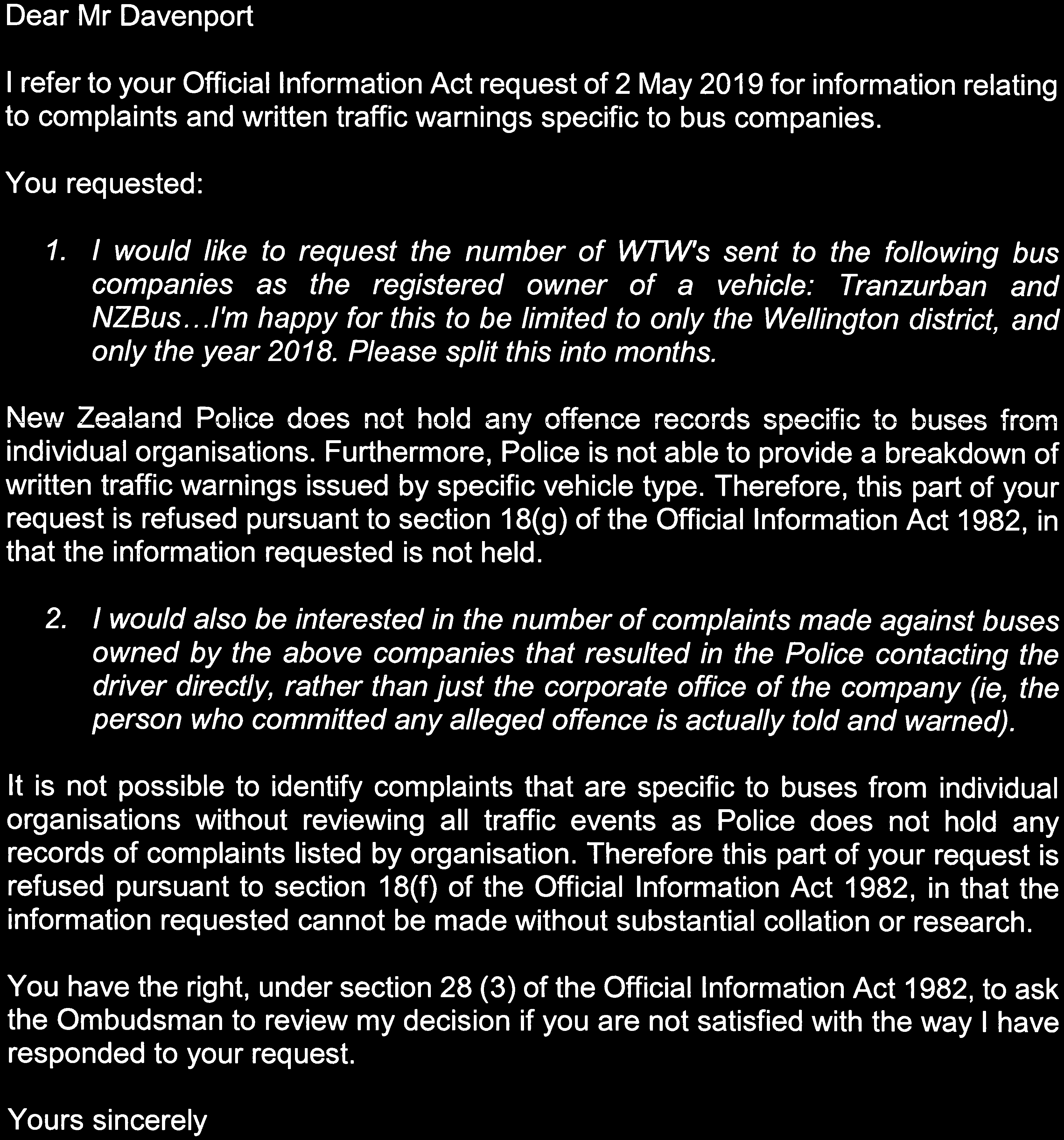 Information regarding written traffic warnings (WTW's) sent to bus companies