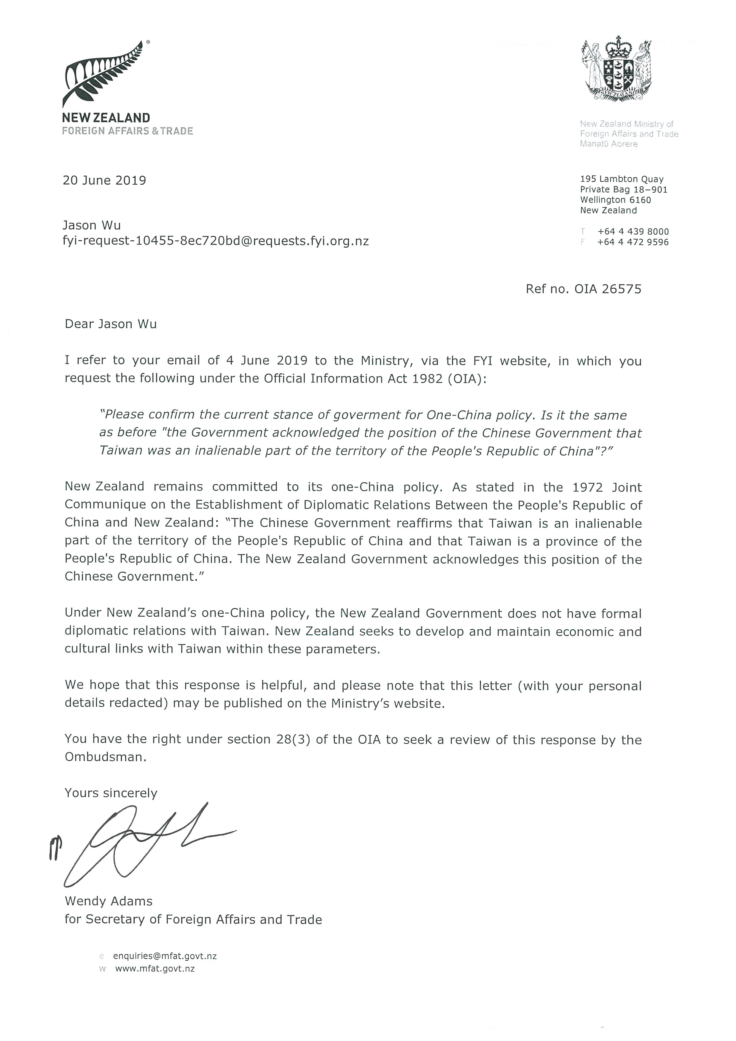 Clarification of One-China policy