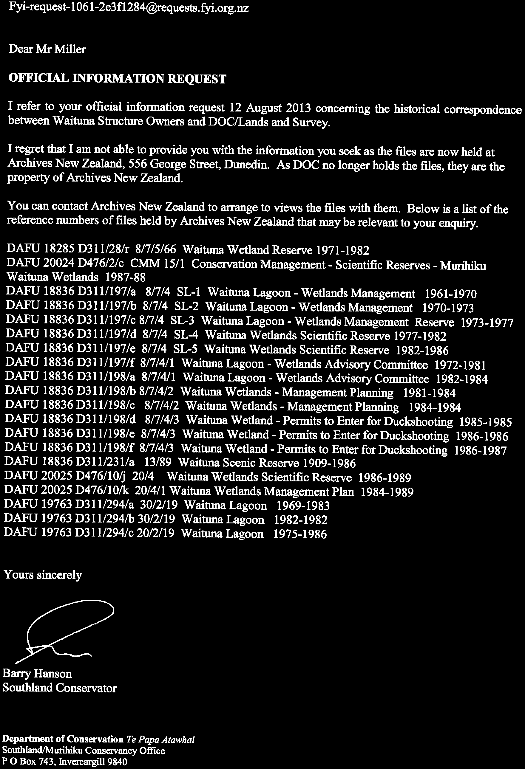 Historical Correspondence between Waituna Structure Owners and DOC/Lands and Survey