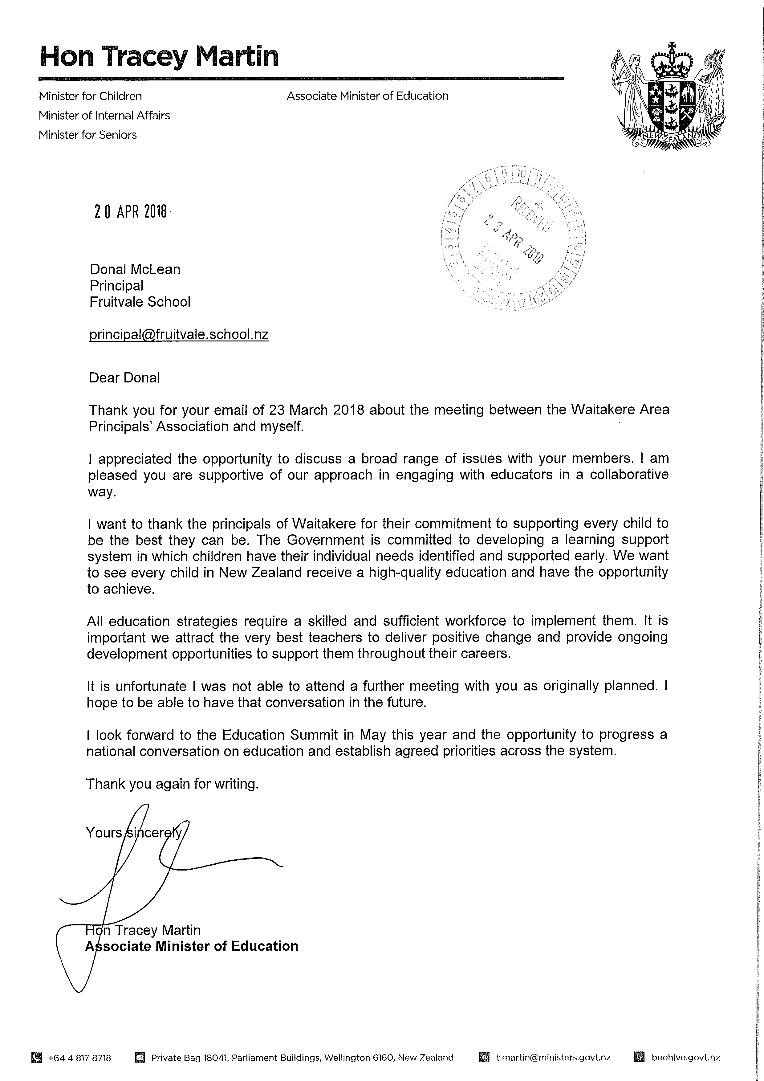 Subject: RE: Waitakere Area Principals Association meeting with Tracey Martin this morning