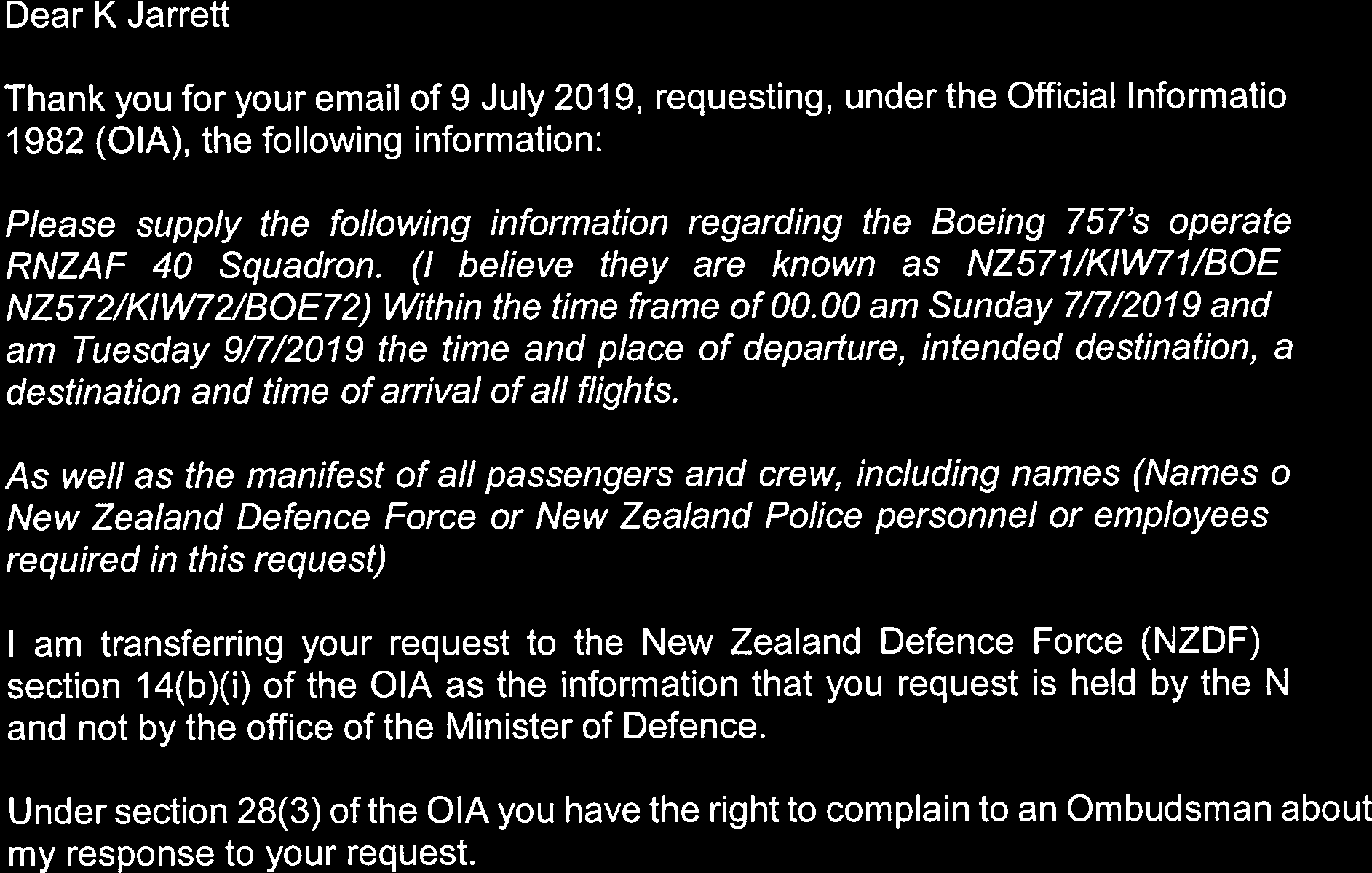 To the Minister of Defence, RNZAF 40 Squadron Movements