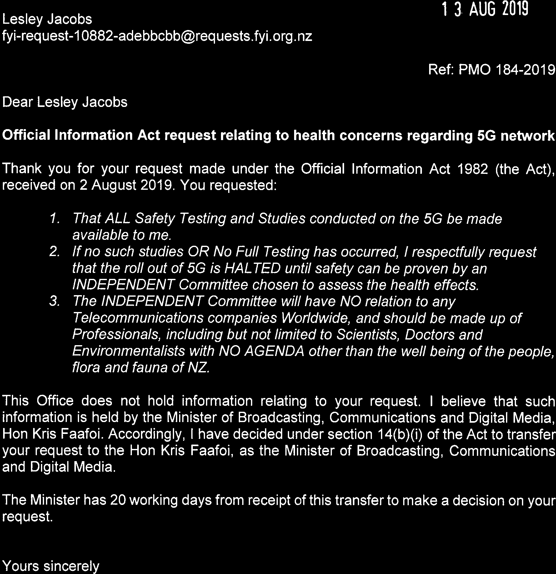 Official Information Act request: I request copies of the Safety Studies that have been done to ENSURE 5G is safe for Humans, Insects and Wildlife alike