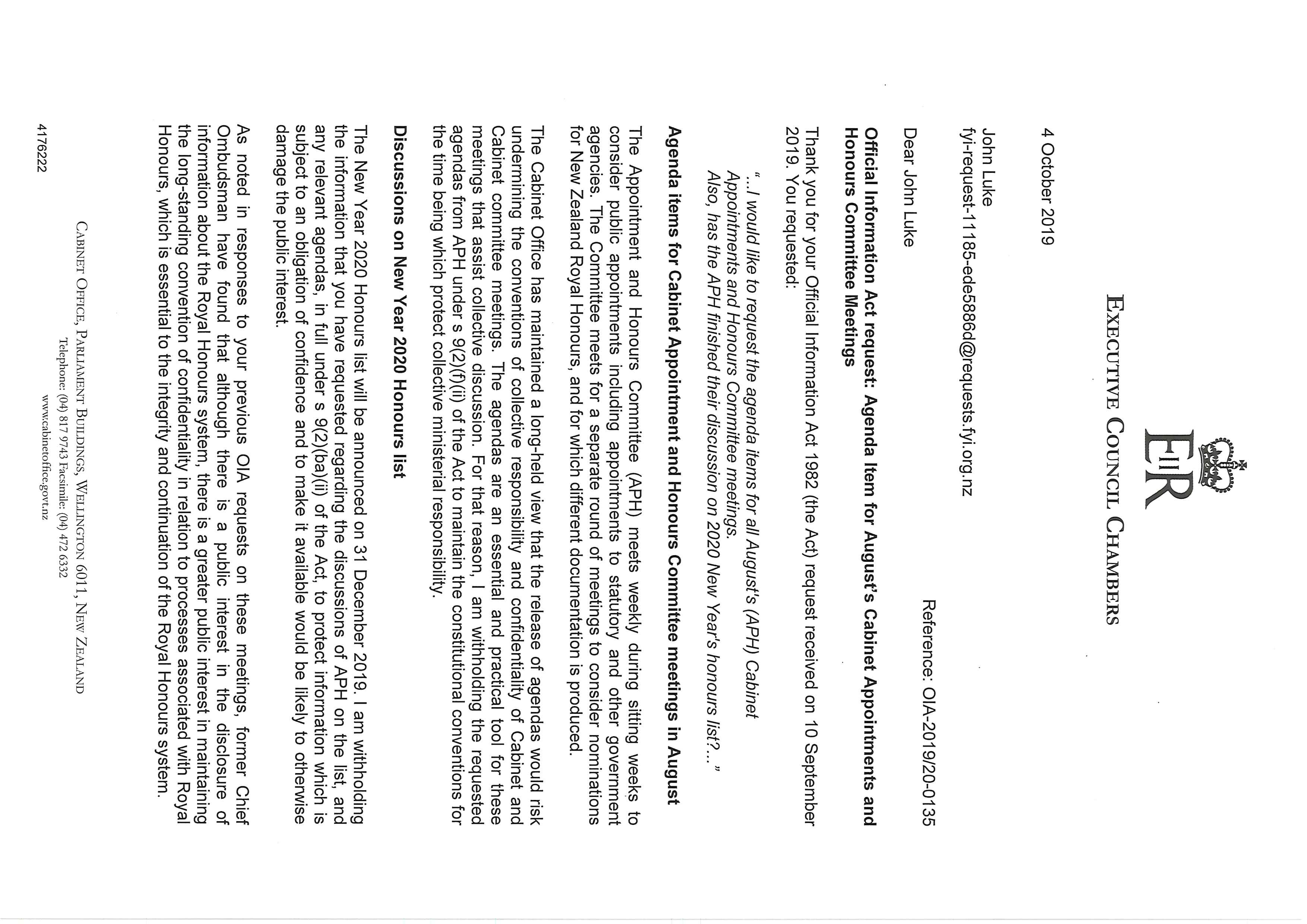 Agenda for all August's (APH) Cabinet Appointments and Honours Committee