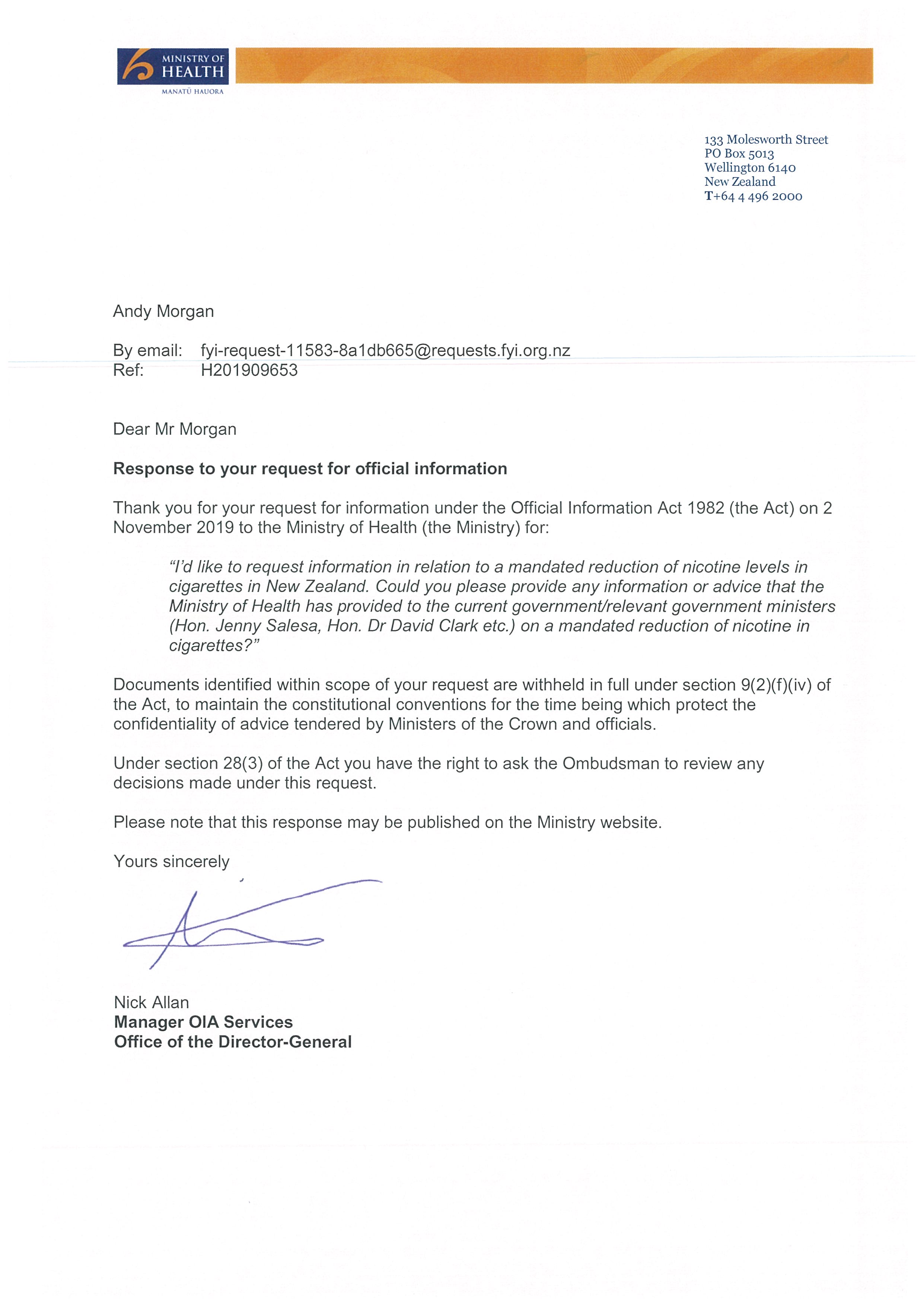 Information/advice provided on a mandated reduction of nicotine in cigarettes