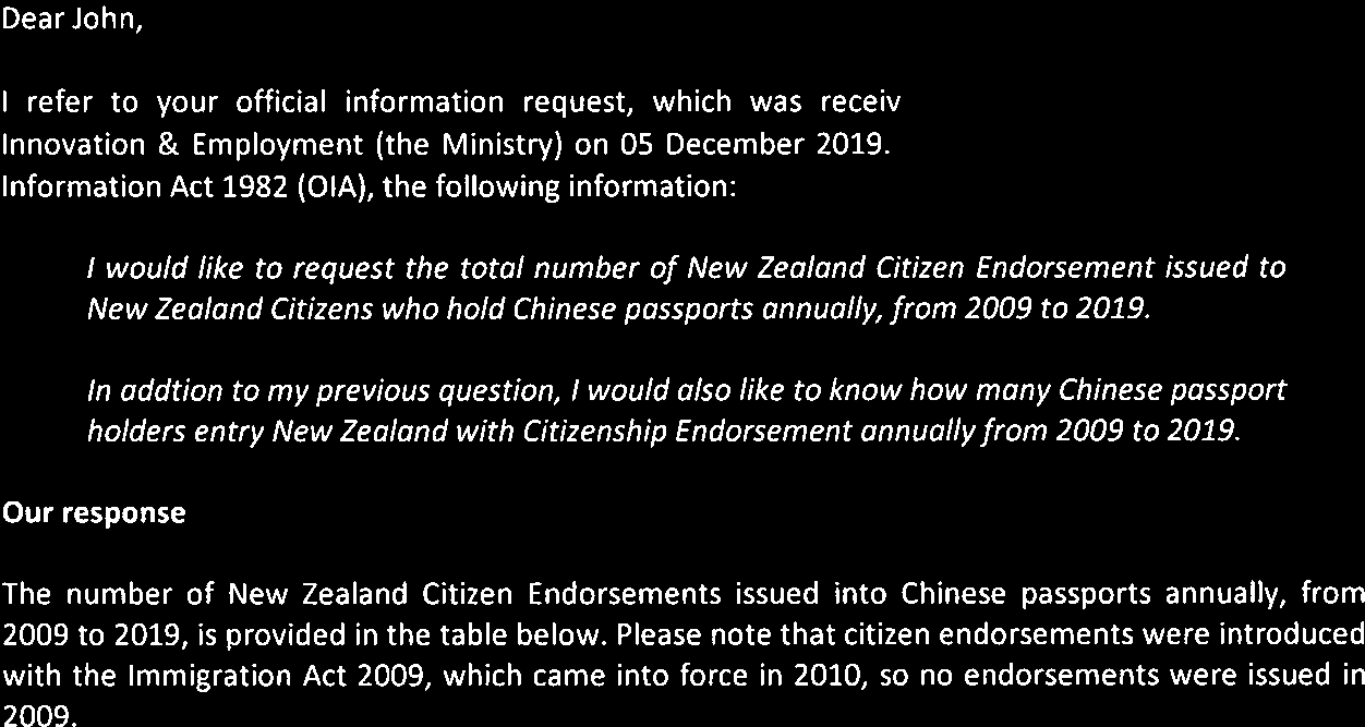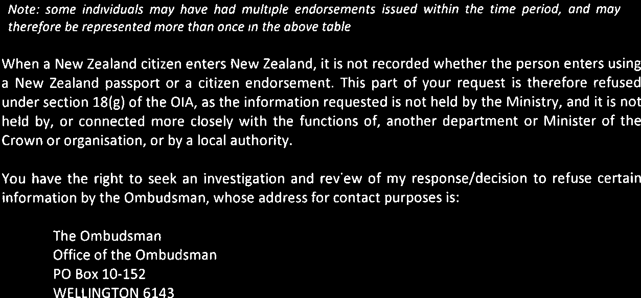 Total number of New Zealand Citizen Endorsement issued to New Zealand Citizens who hold Chinese passport