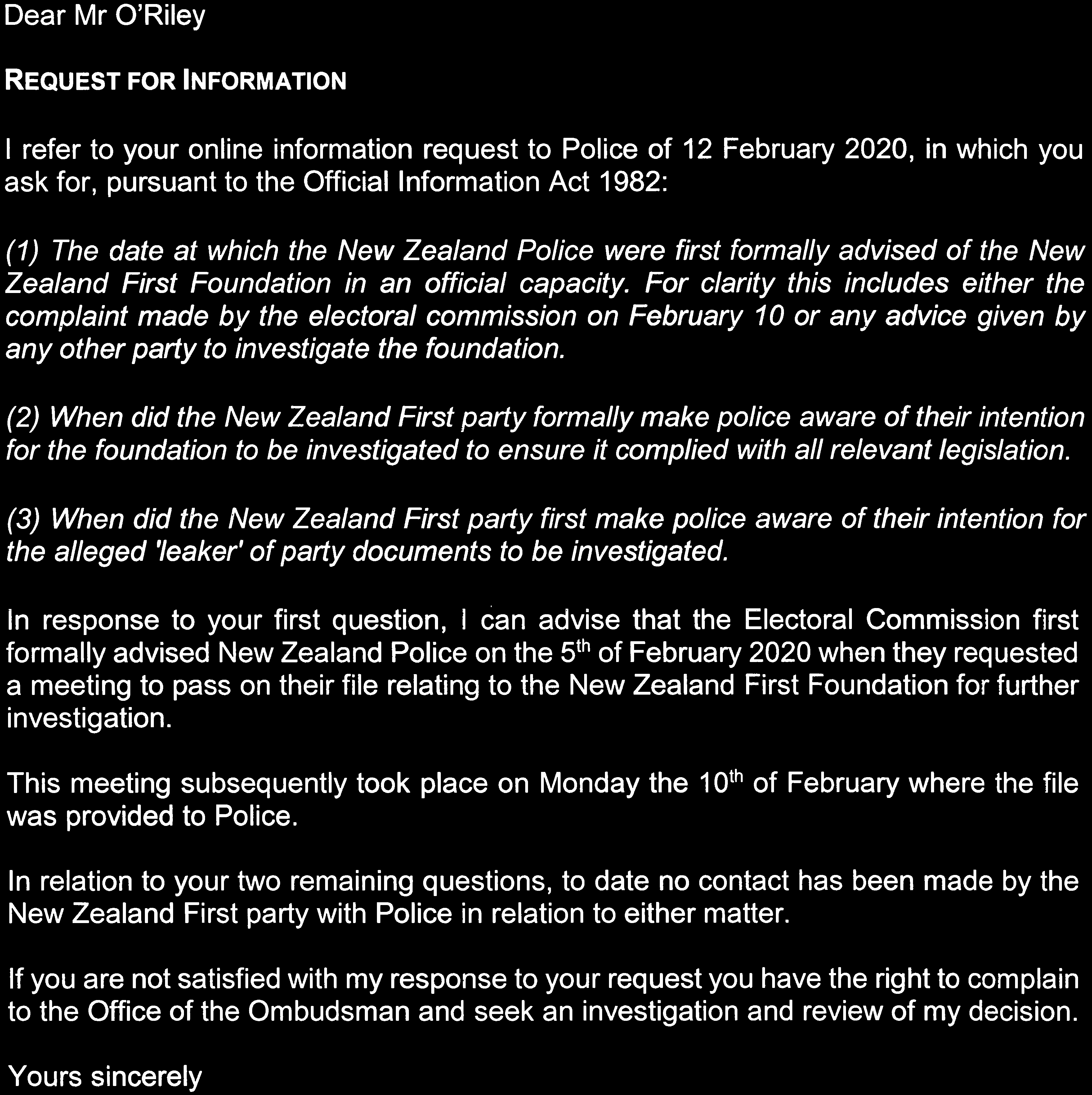 Complaint received regarding the NZ First Foundation