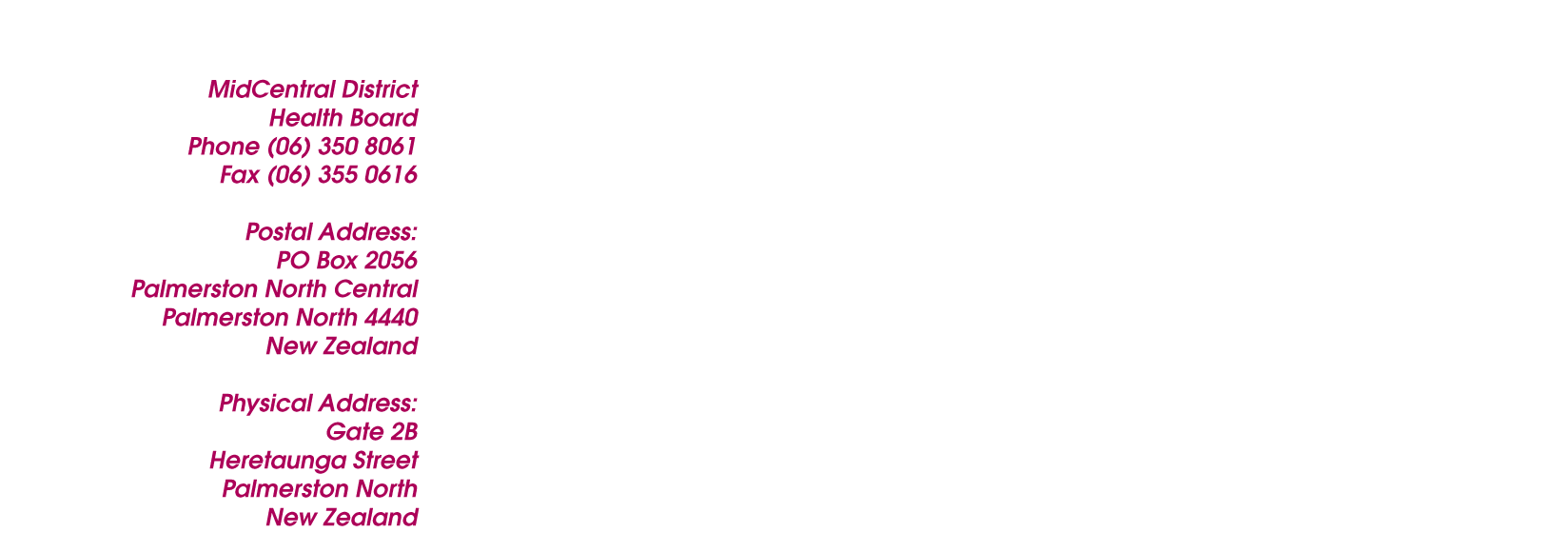 MidCentral District Health Board, PO Box 2056, Palmerston North. Phone: 06 350 8928