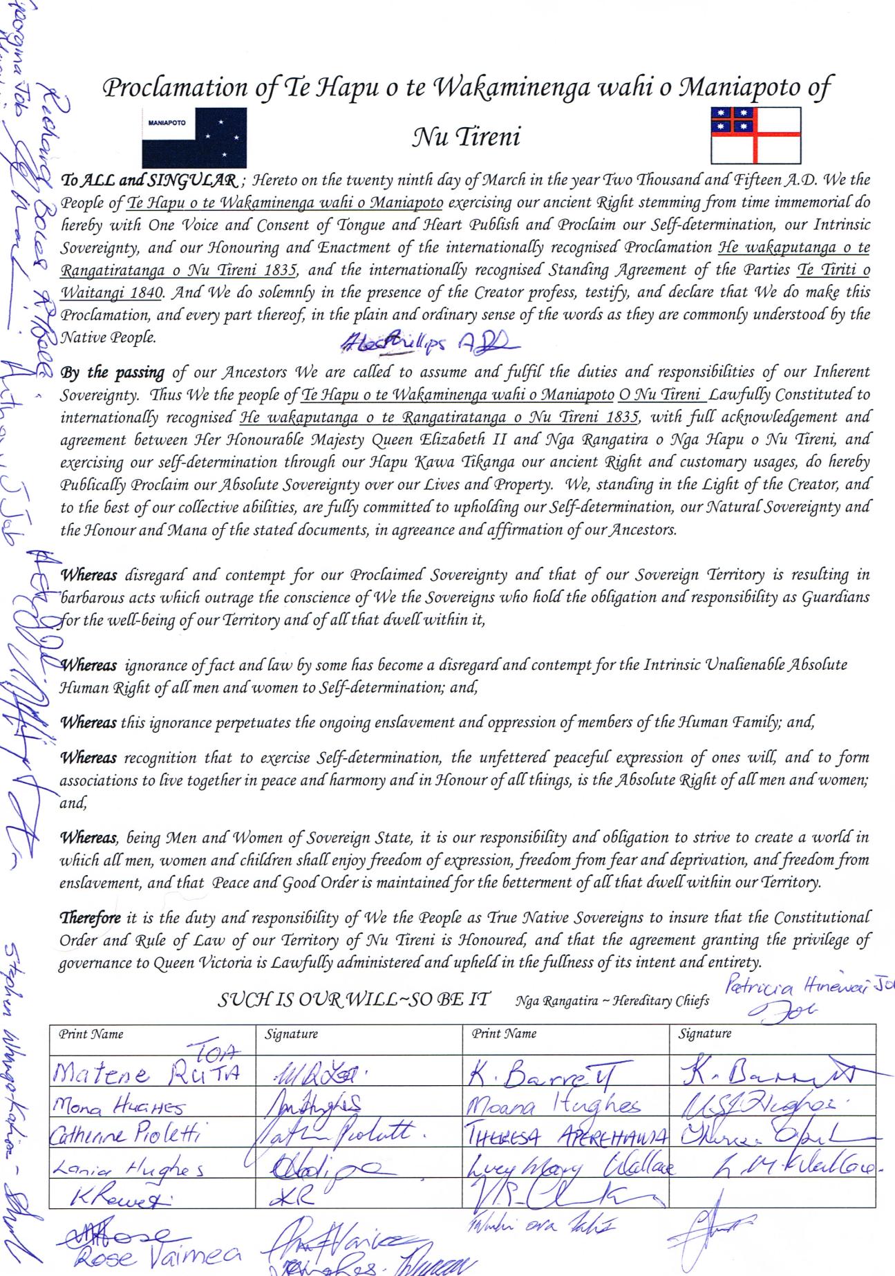 Internationally Recognised Proclaimed Hapu Authority, Enacted in accordance with