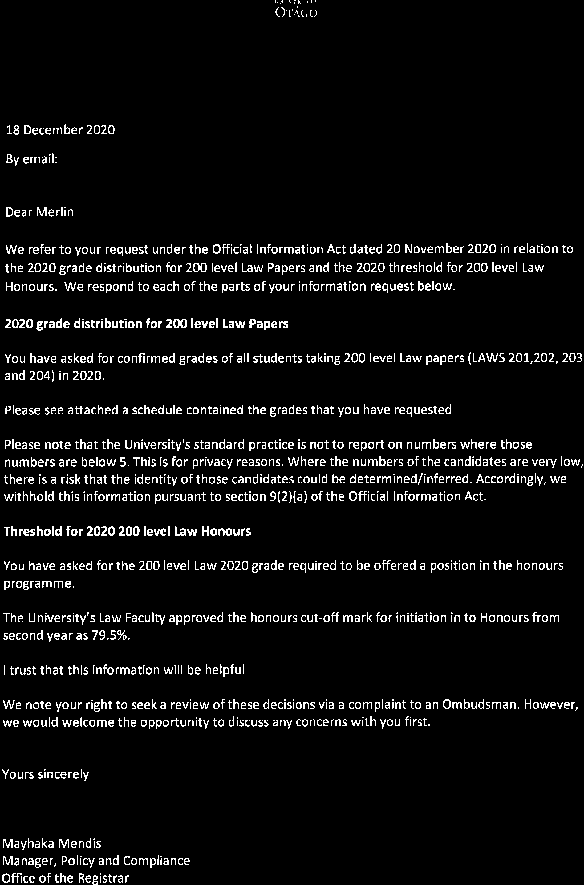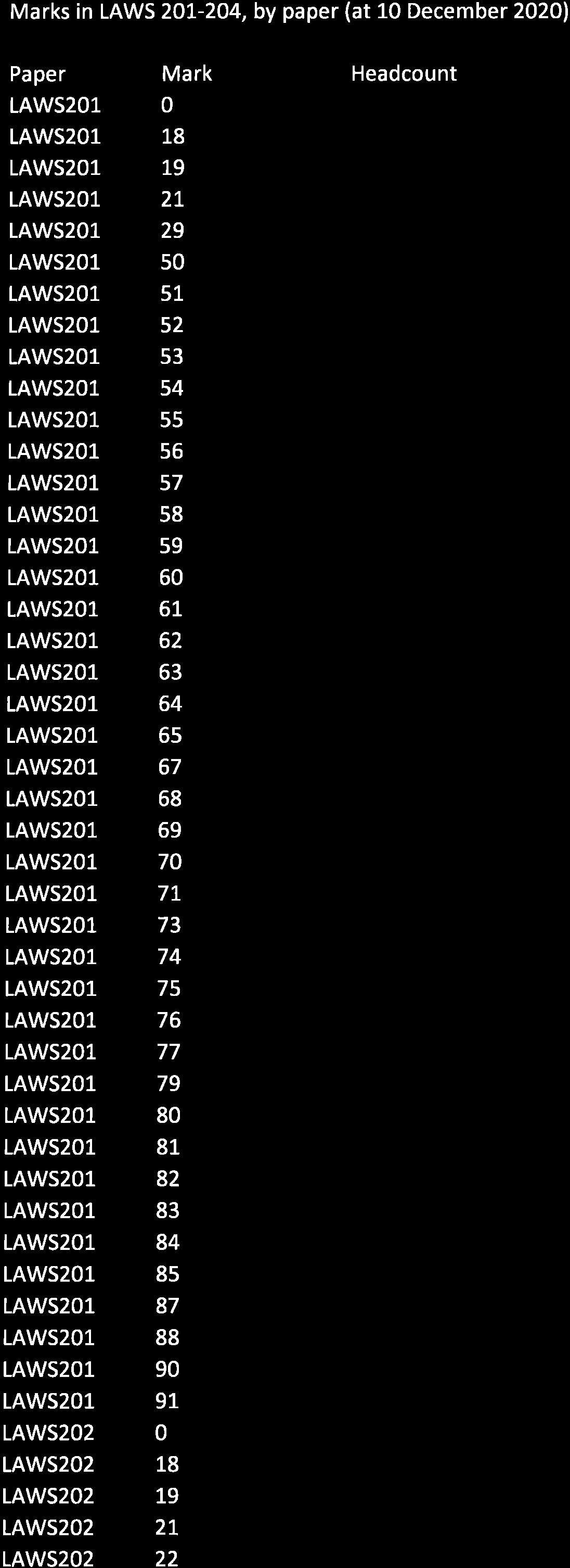 2020 Grade Distribution for 200 Level Law Papers and 200 Level Law Honours Threshold