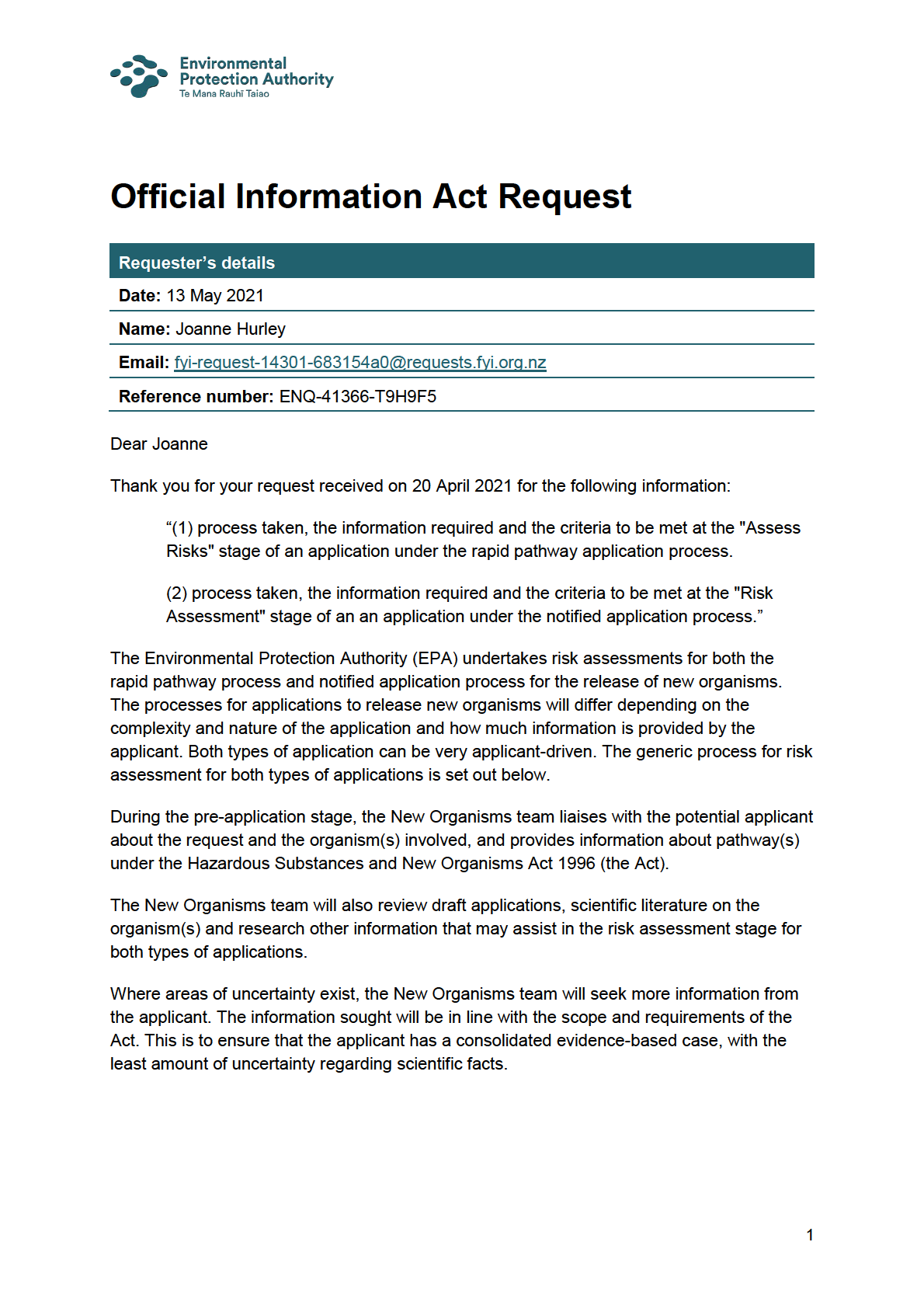 We wil publish your request and our response on our website, www.epa.govt.nz, within 10