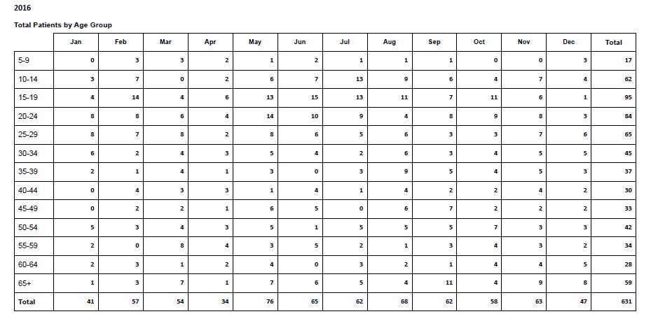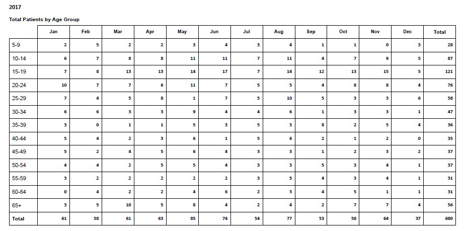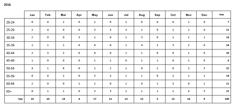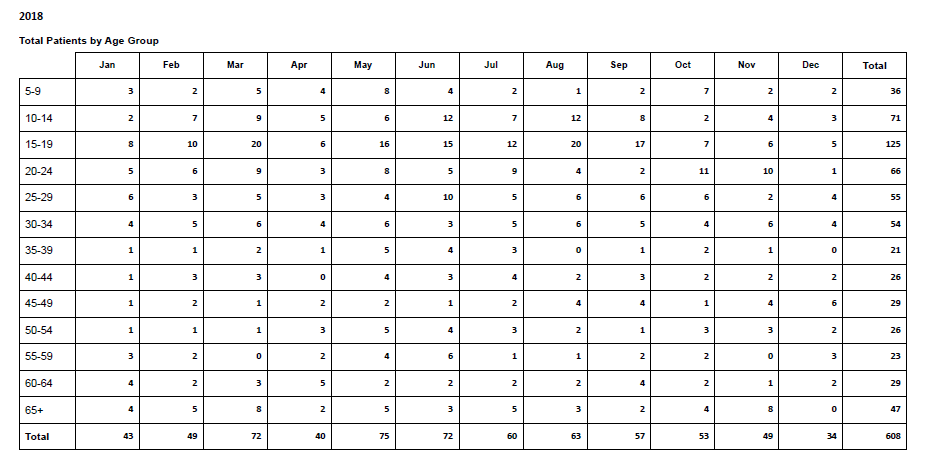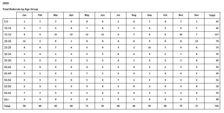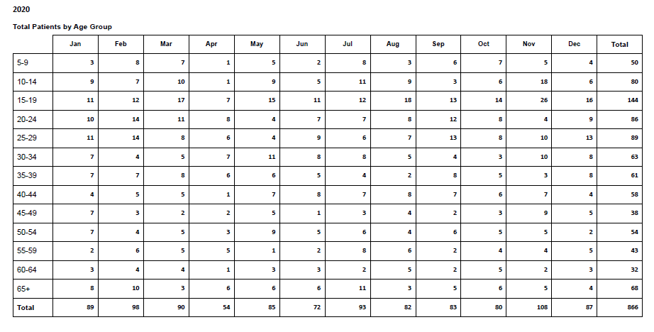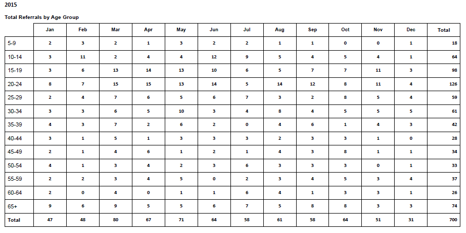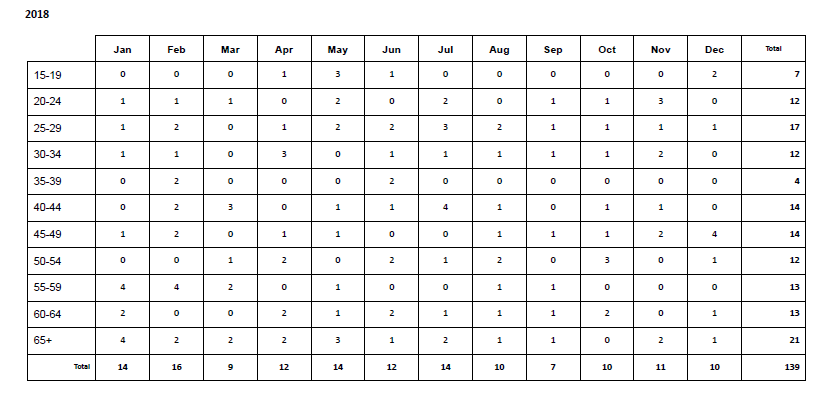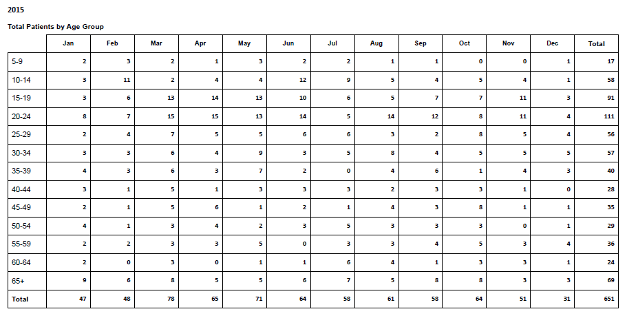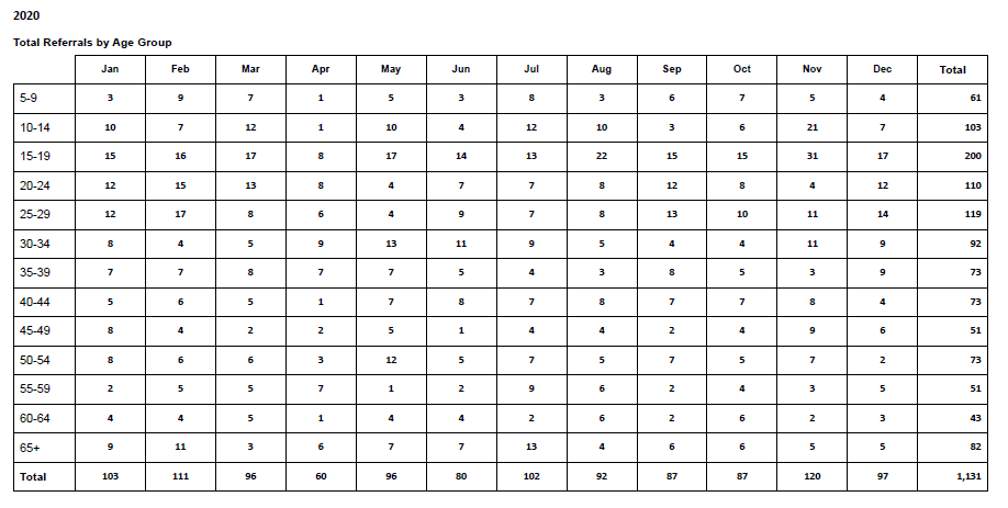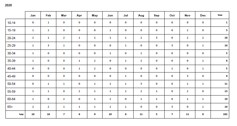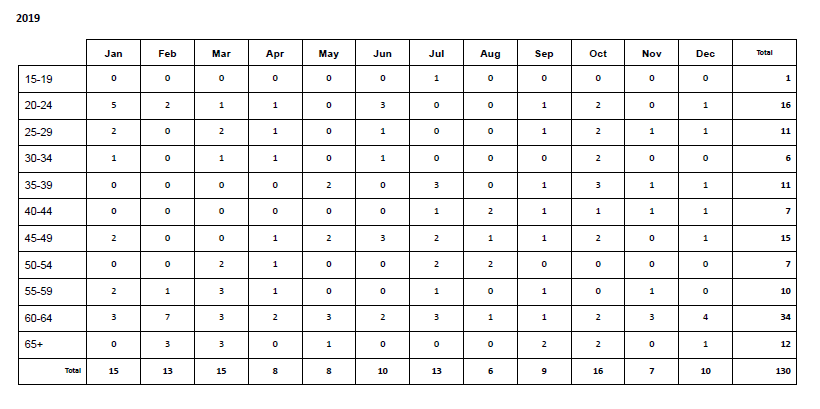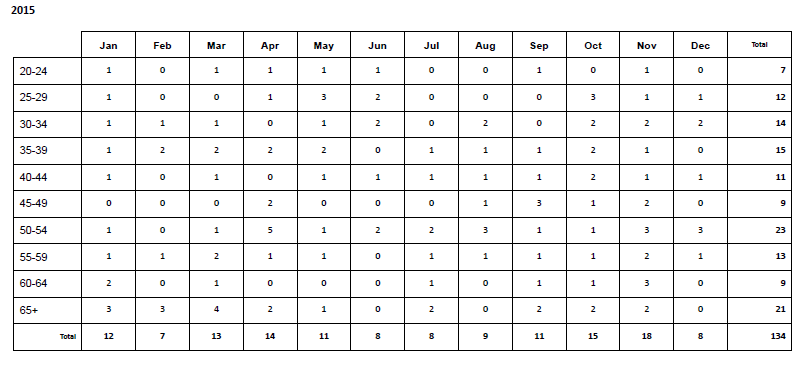 a. Number of distinct new entries/cases per month, by age group (five-year bands if possible*), 2015 – 2020