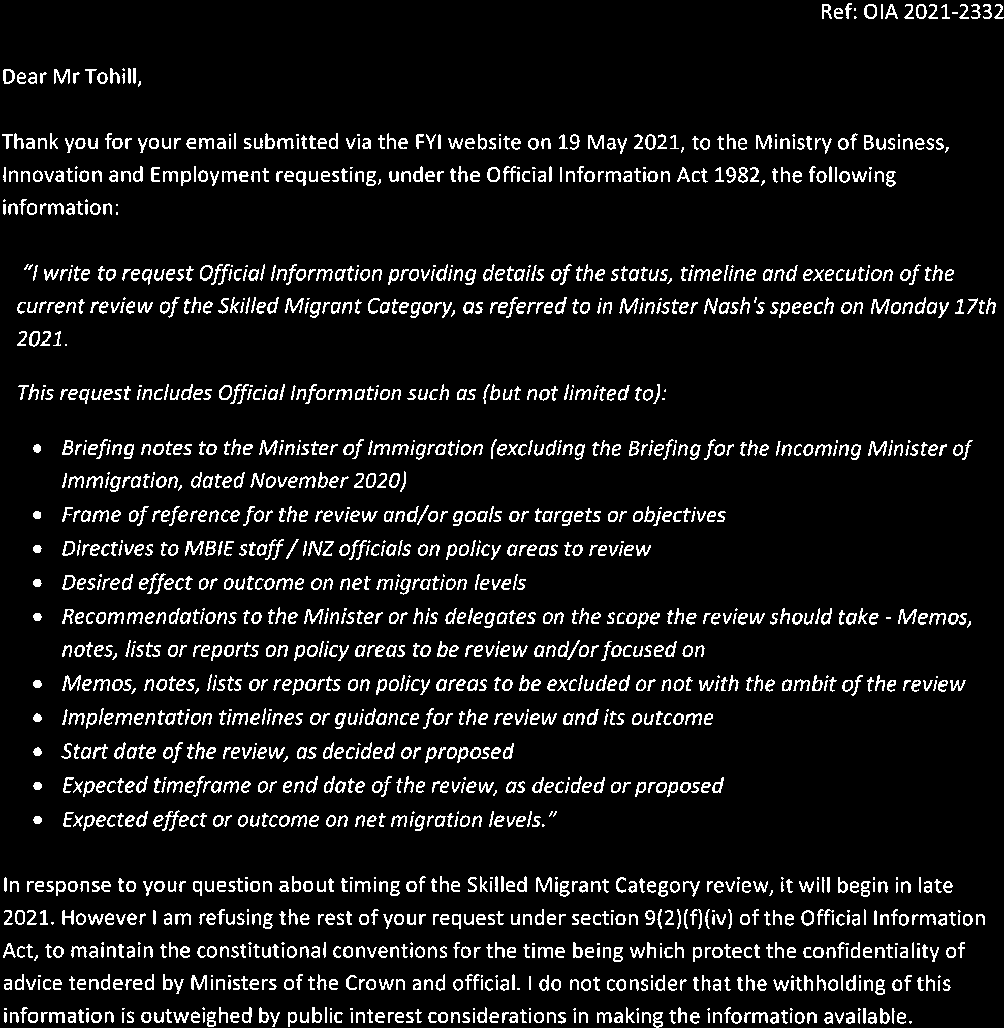 Request for details on the current review of the Skilled Migrant Category