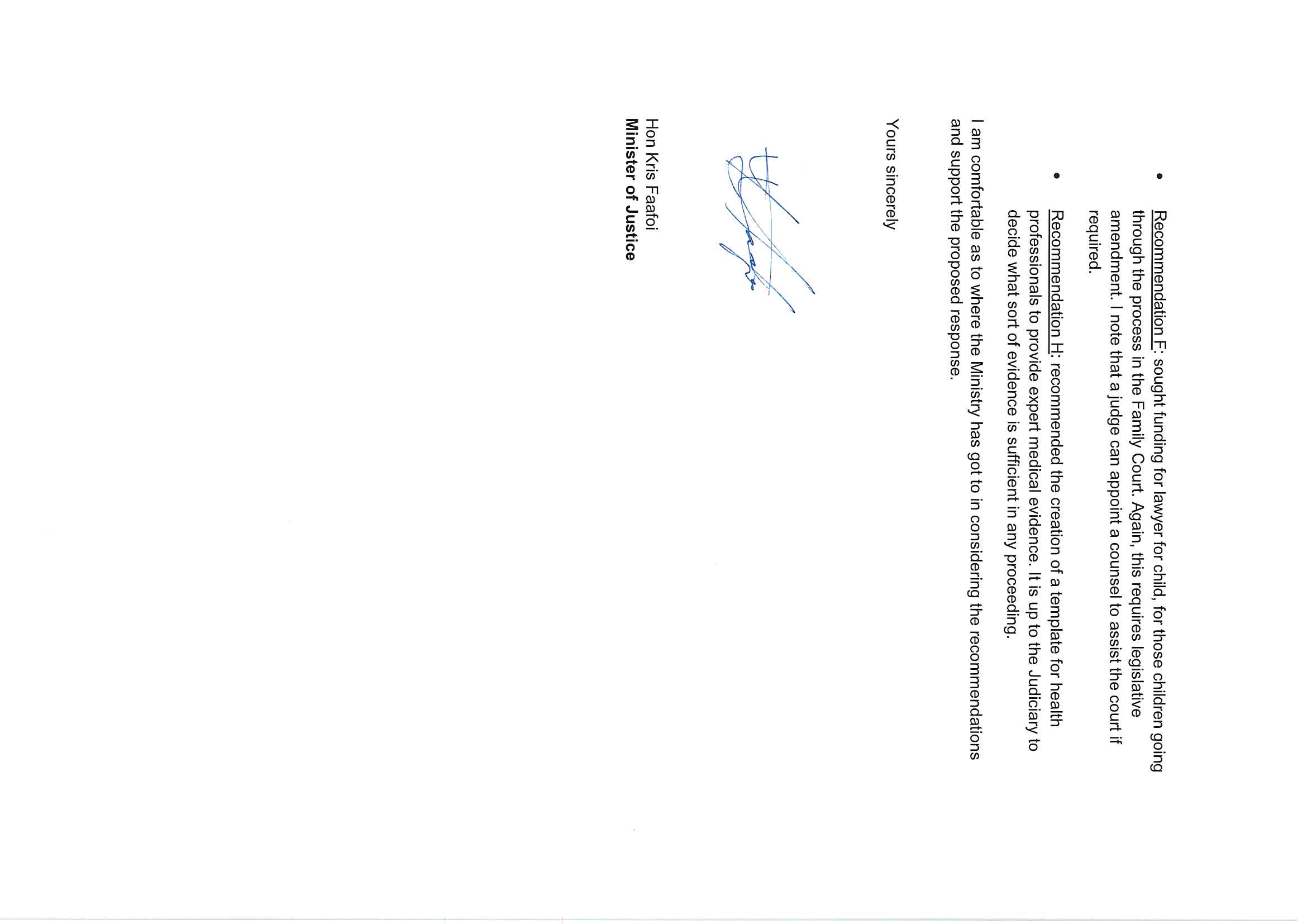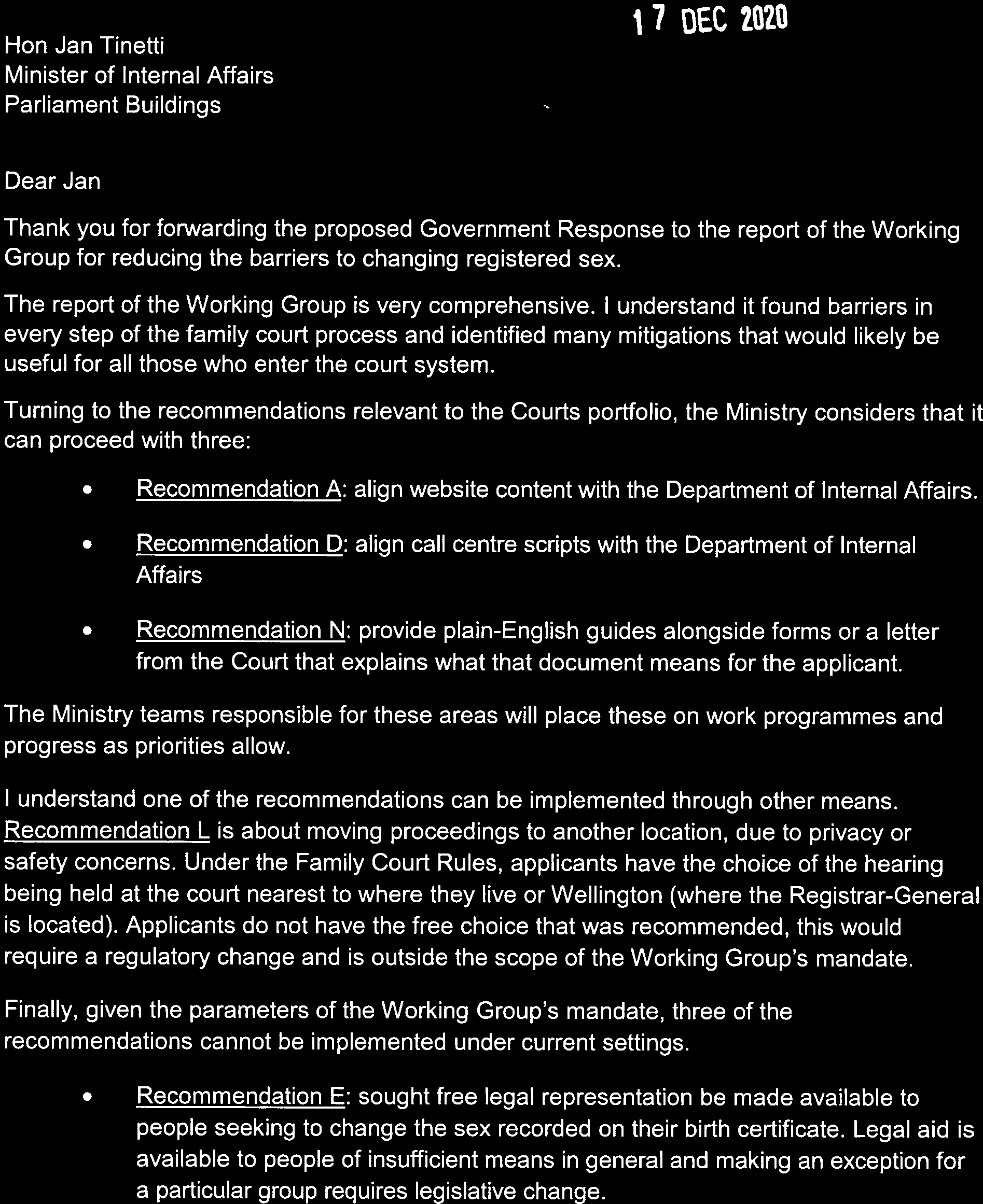 1. Minister Tinetti has asked you for feedback on the Ministry of Justice response to