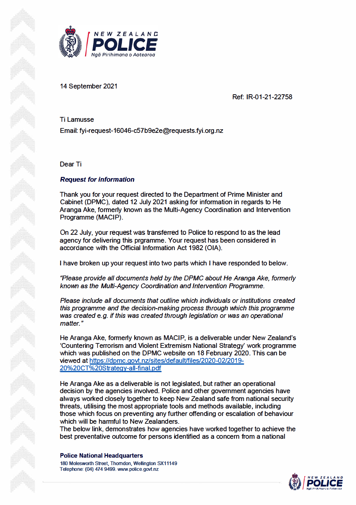 In December 2020, the Prime Minister of New Zealand announced MACIP as one