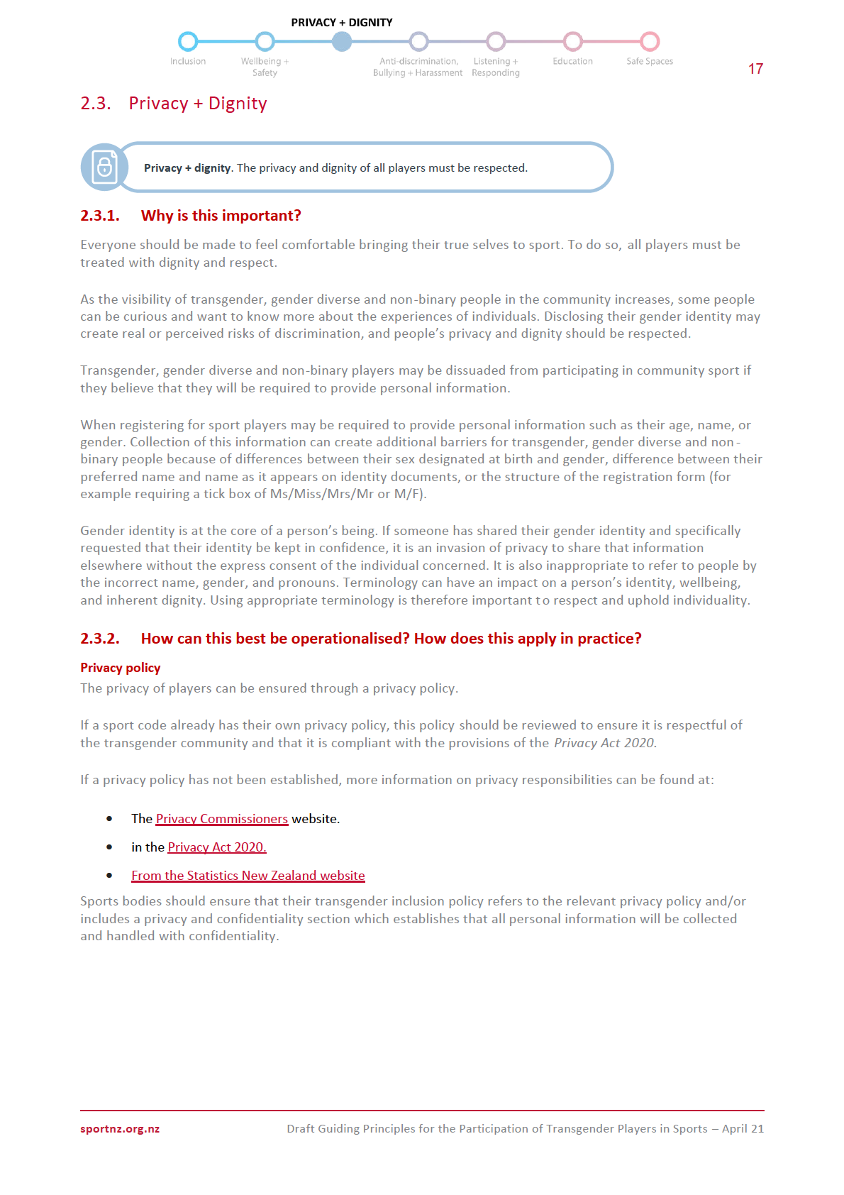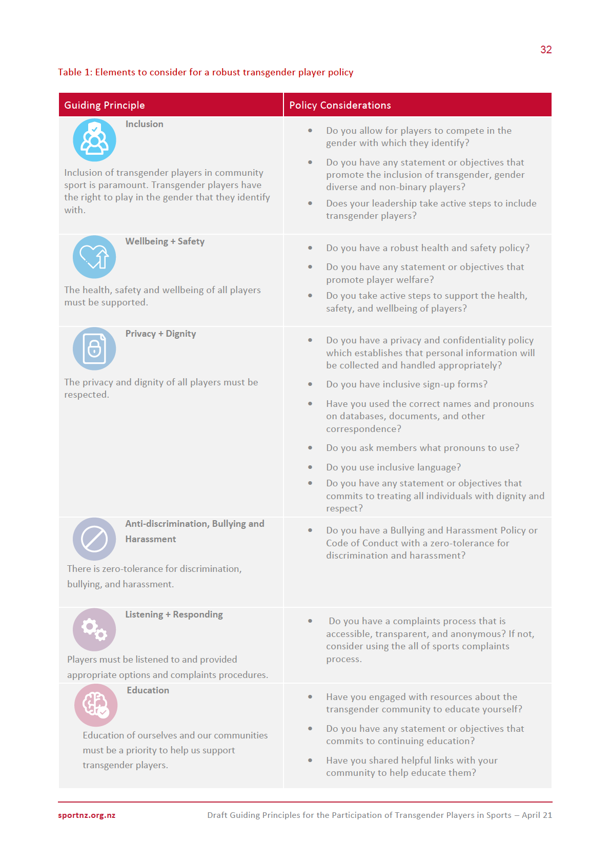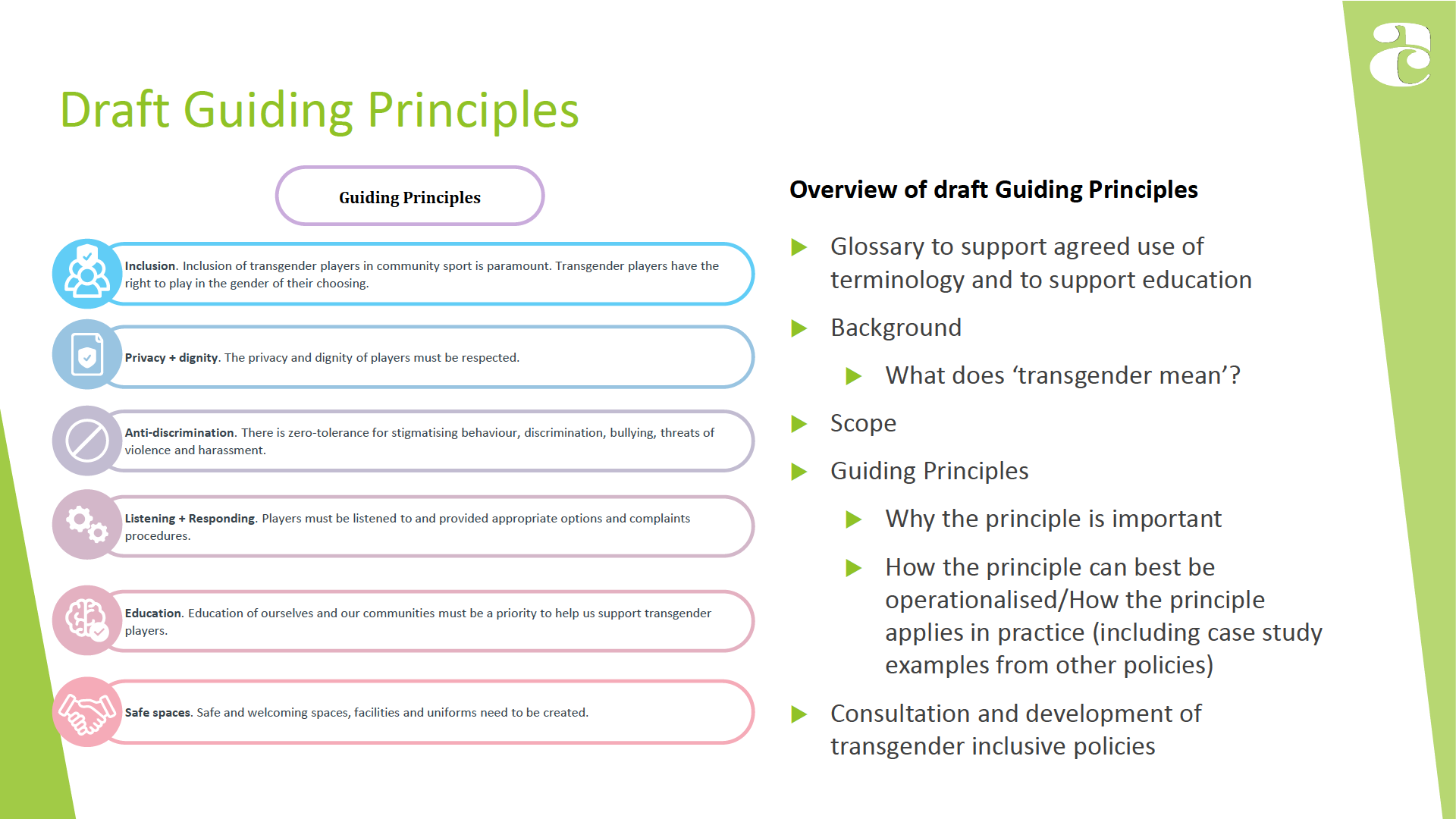 Principles have also been informed by international sporting policies that are transgender inclusive.