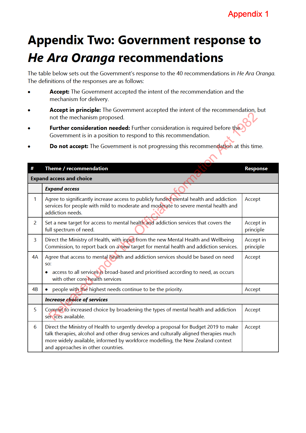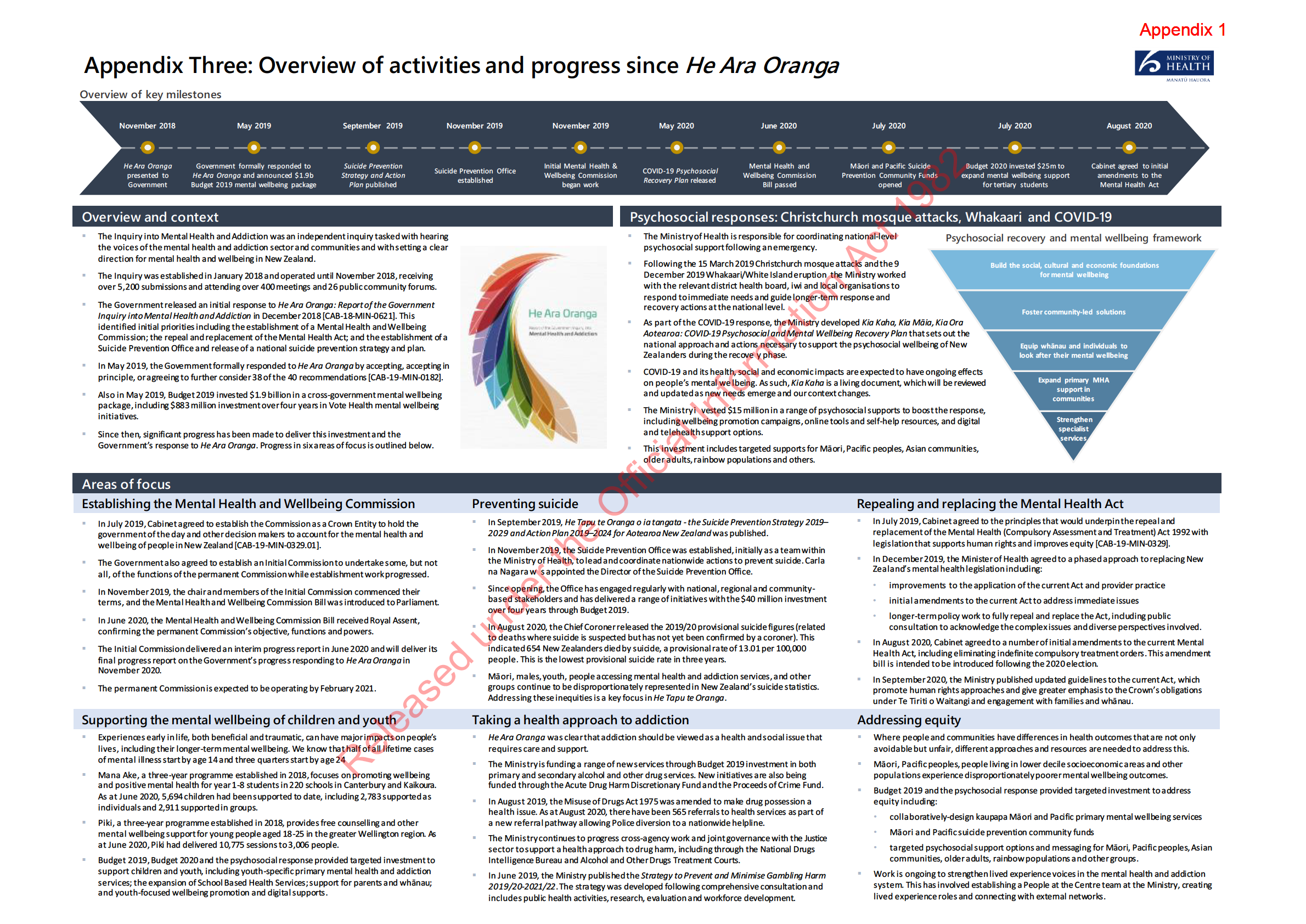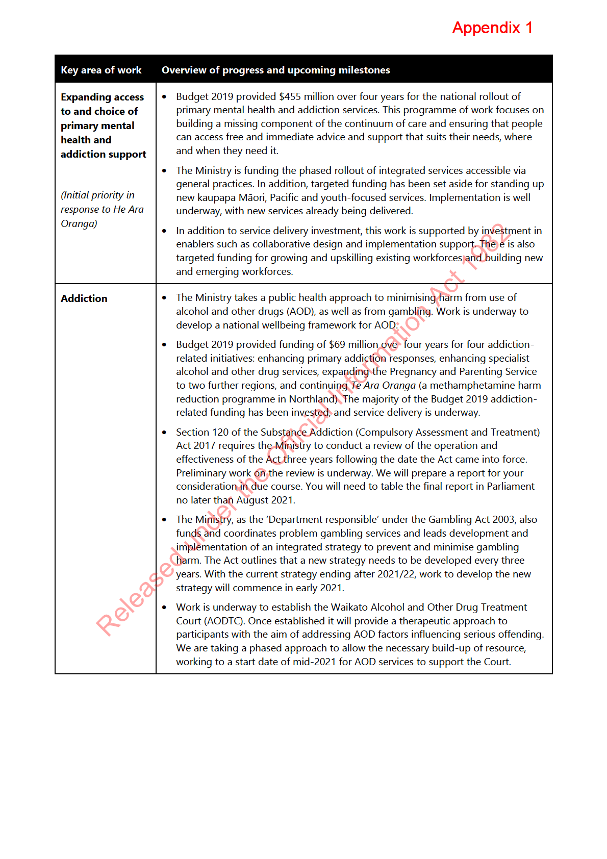 Note: This is an indicative overview of potential activities to implement priority areas of the Government’s response to He A ra Oranga and the confirmed investment in mental health and addiction. Some activities are unconfirmed and subject to future Ministerial or Cabinet decisions. This is not intended to pre-empt or advise on those decisions.