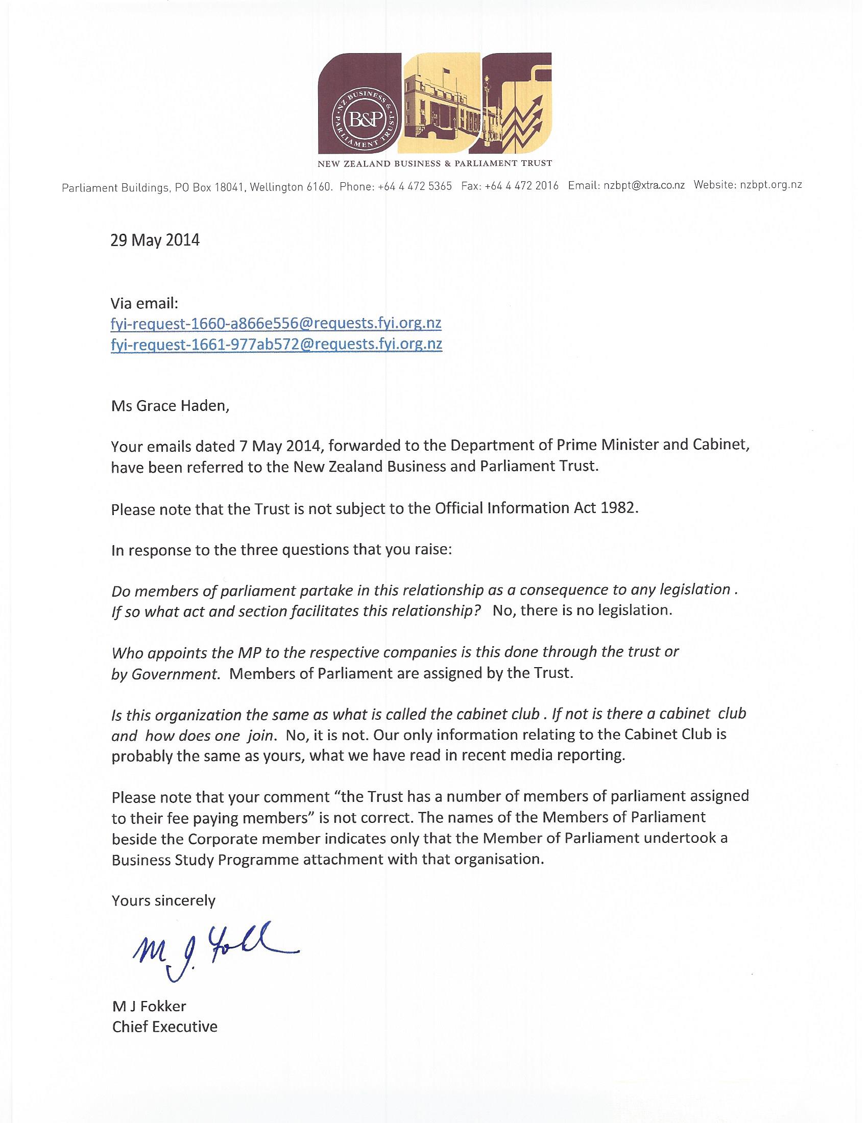 Under which legisaltion do the members of parliament have any obligation to the New Zealand Business and Parliament Trust