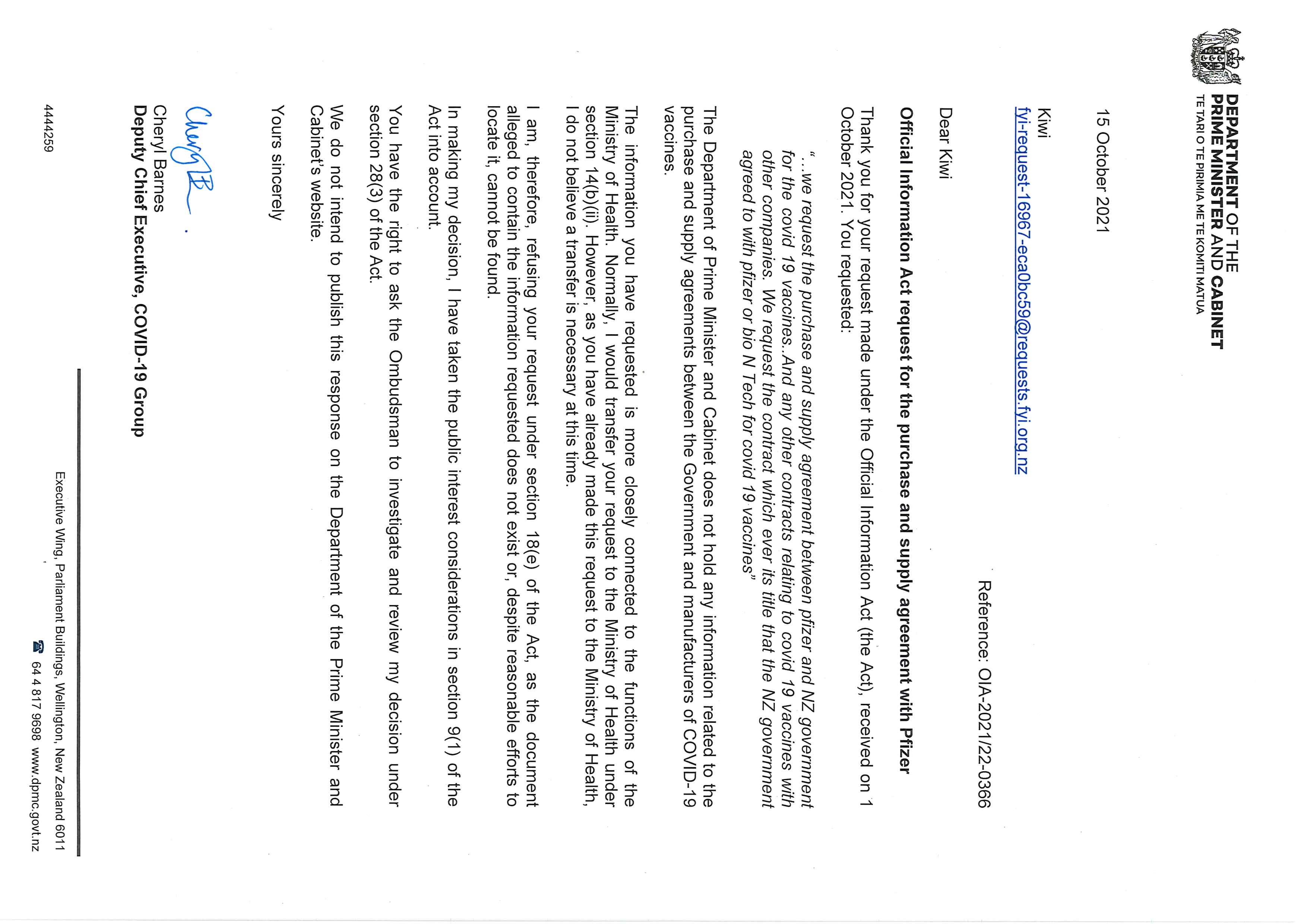 Request the purchase and supply agreement contract between NZ government and pfizer- bio N Tech for the covid 19 vaccine in NZ