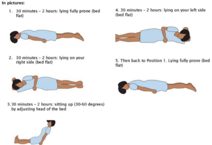 1. 30 minutes to 2 hours lying fully prone (bed flat)