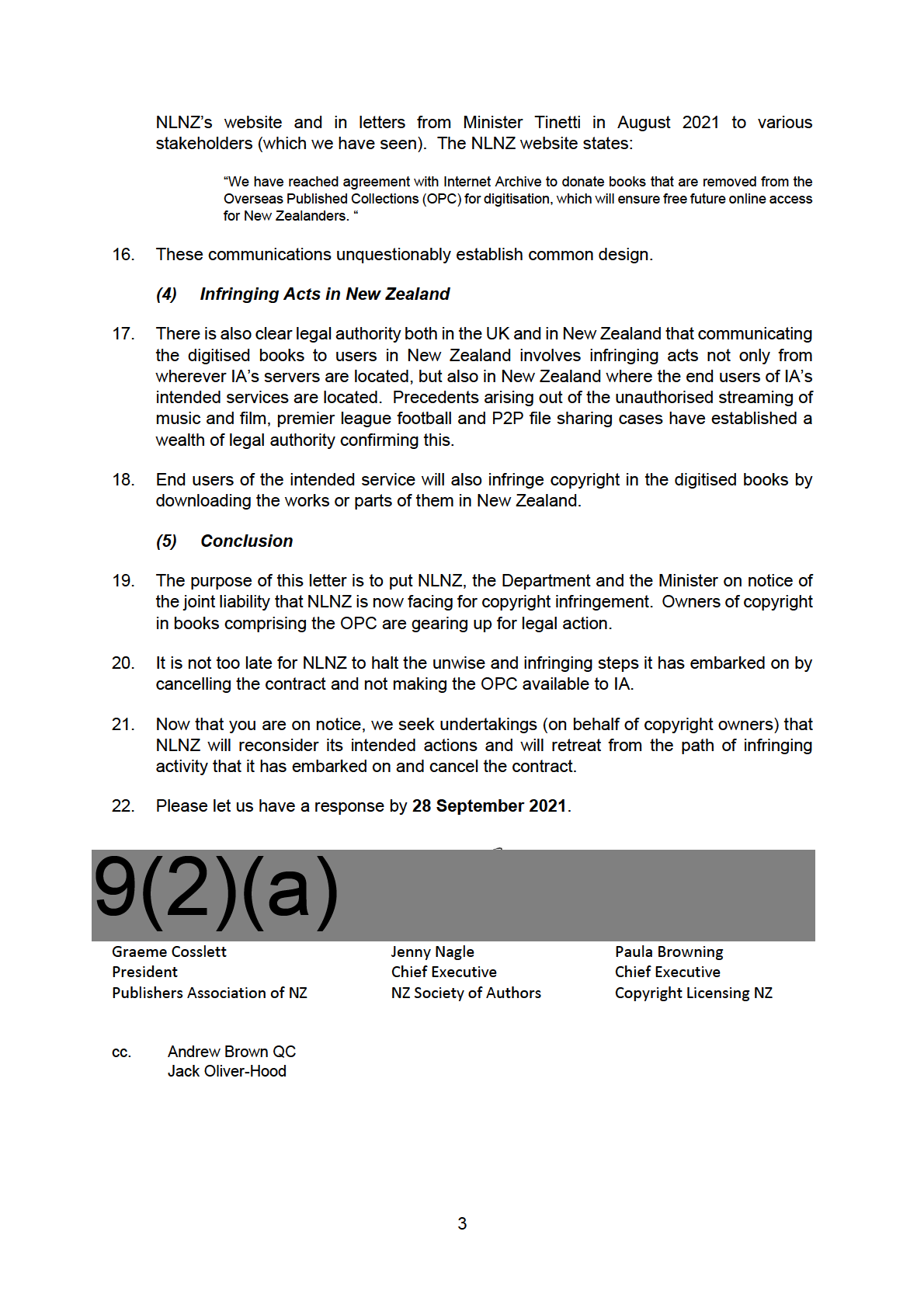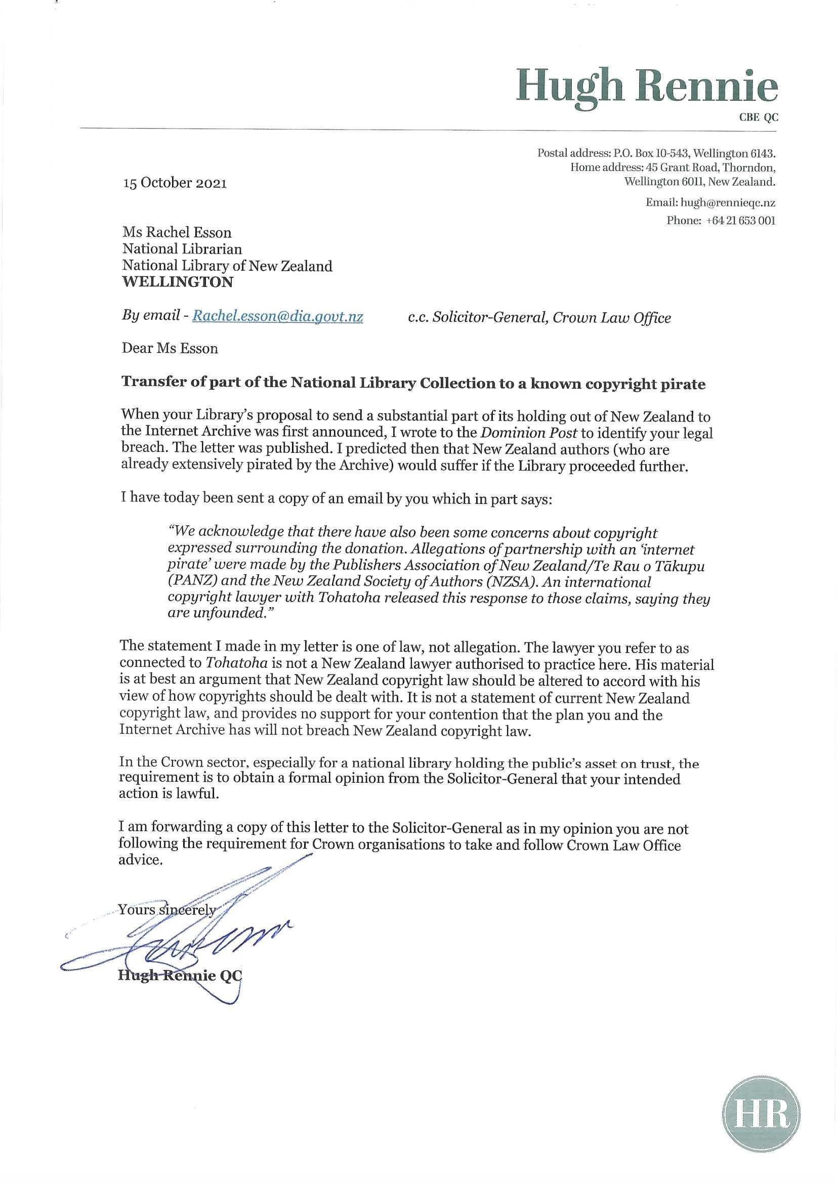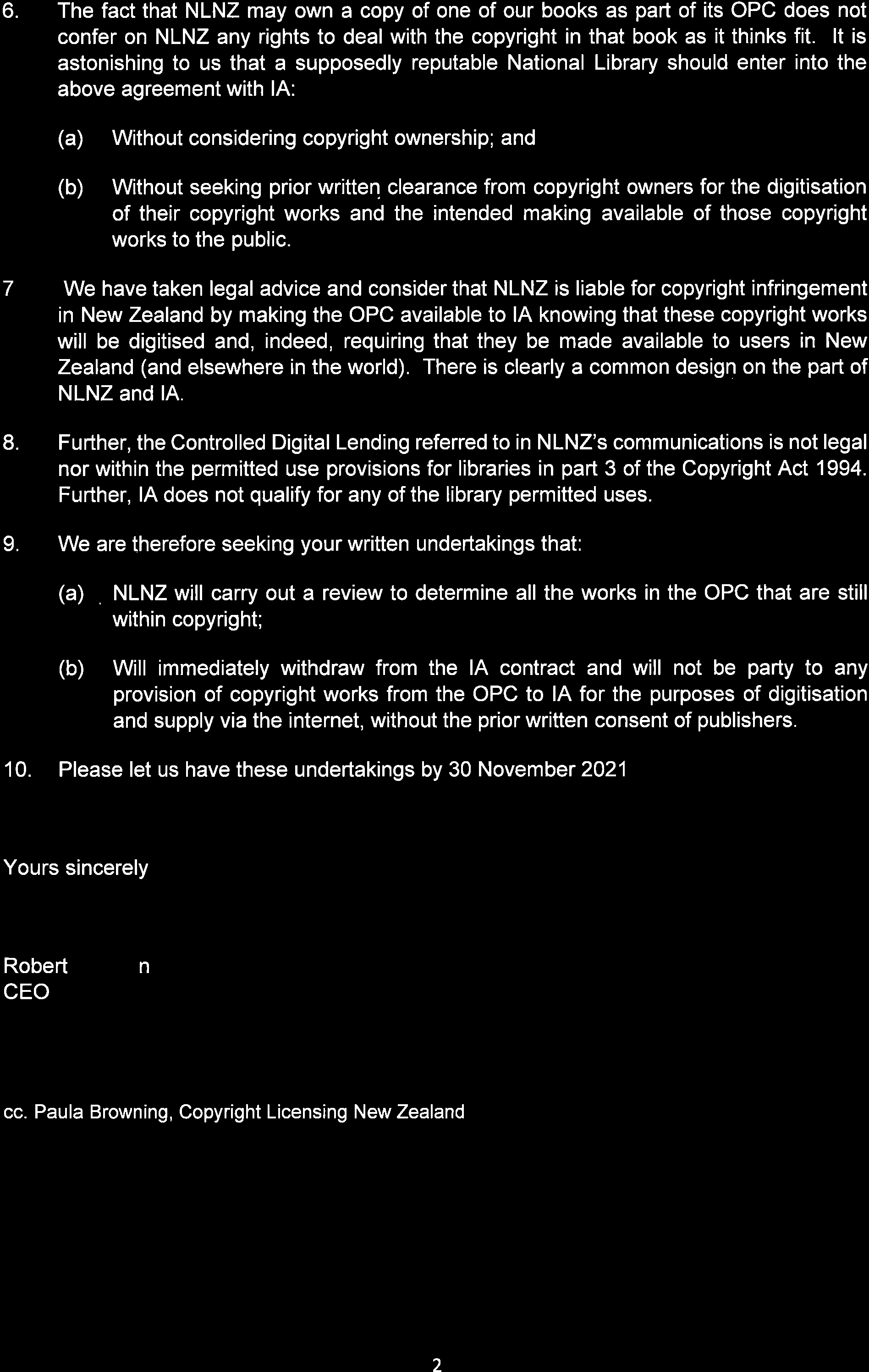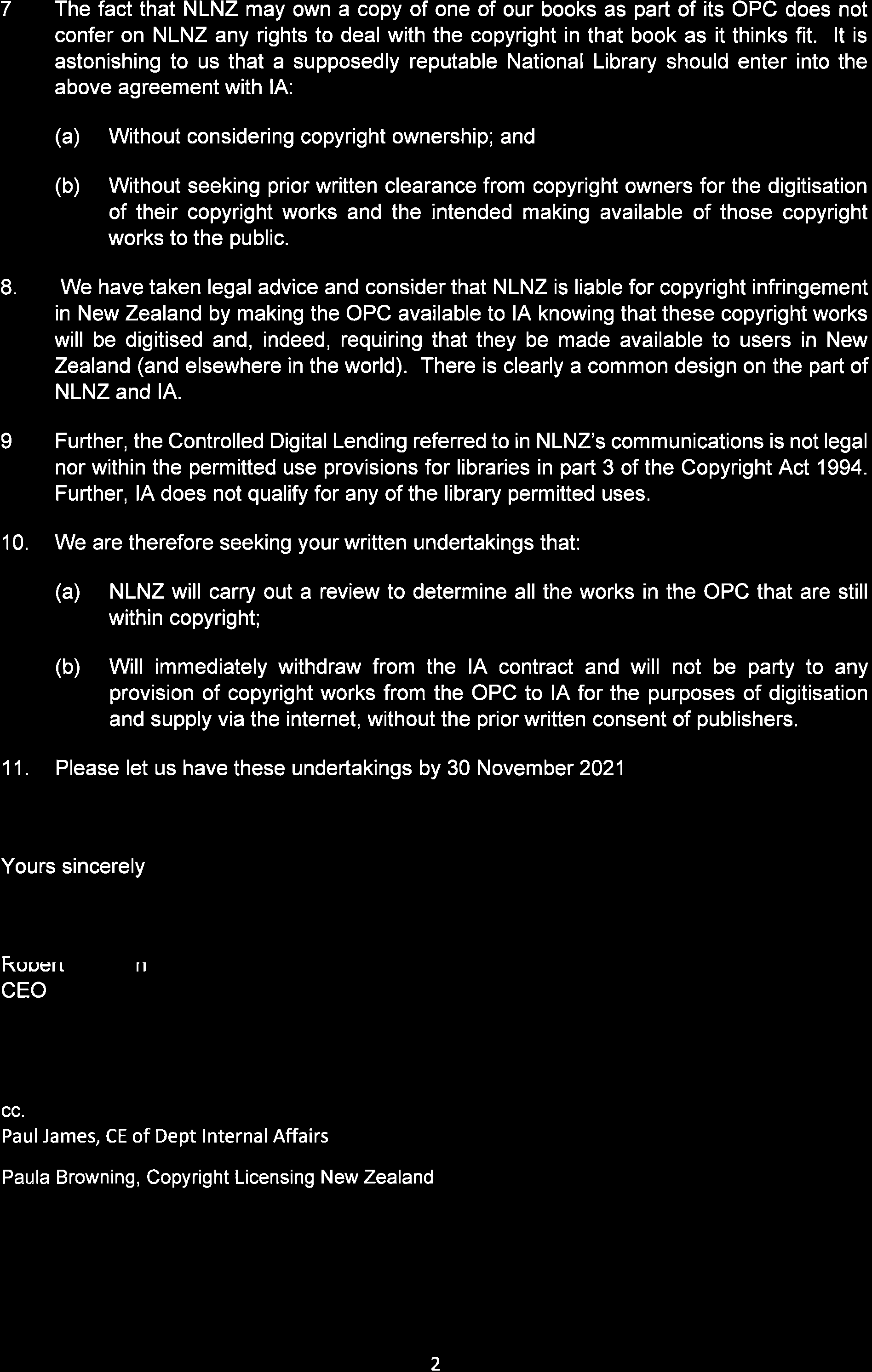 We have taken legal advice and consider that NLNZ is liable for copyright infringement in New 1982