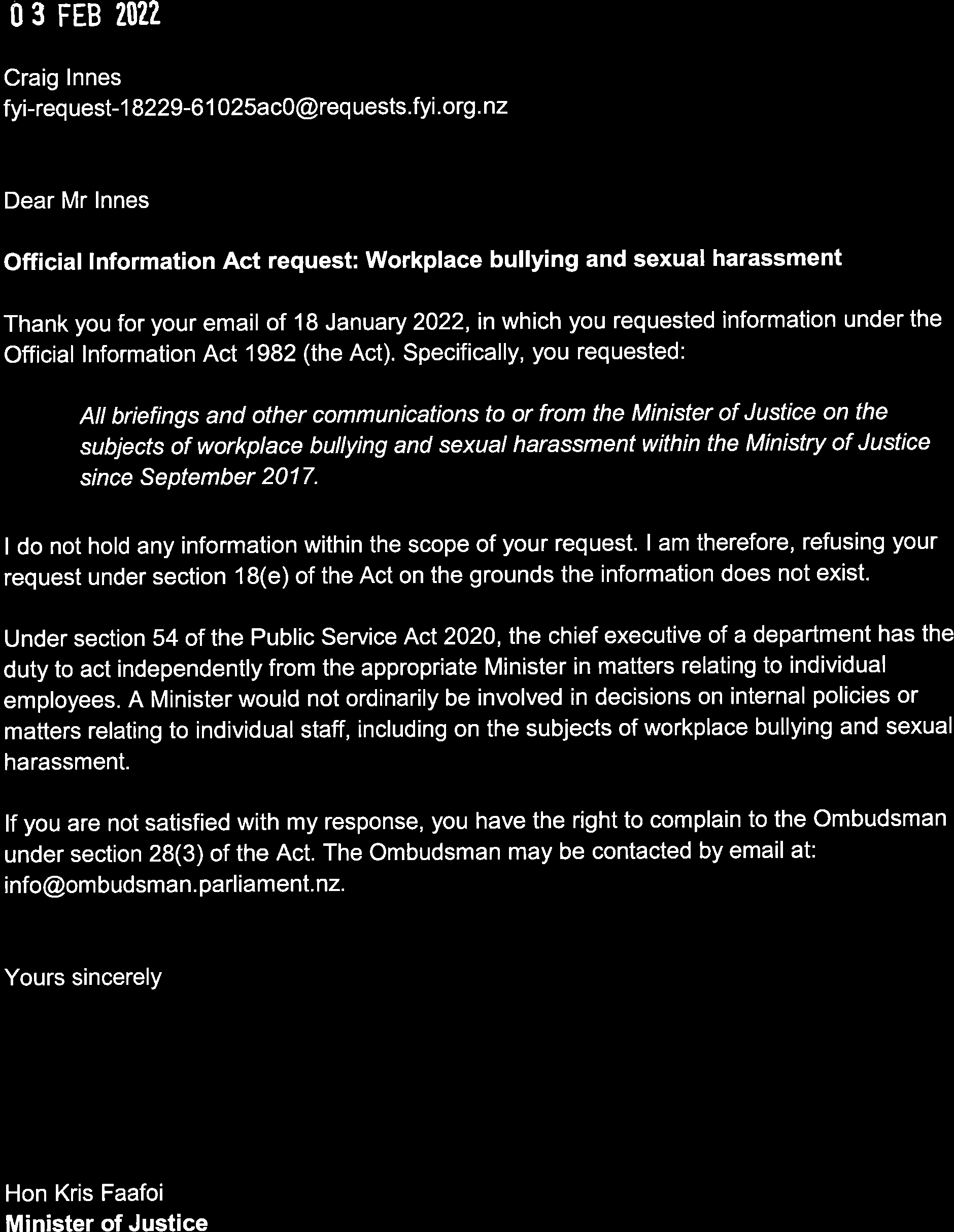 Workplace bullying and sexual harassment at the Ministry of Justice
