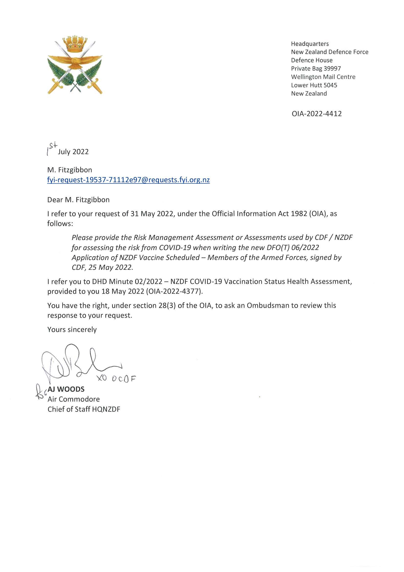 Request for the Risk Management Assessment used by NZDF for DFO(T) 06/2022 Application of NZDF Vaccine Scheduled – Members of the Armed Forces