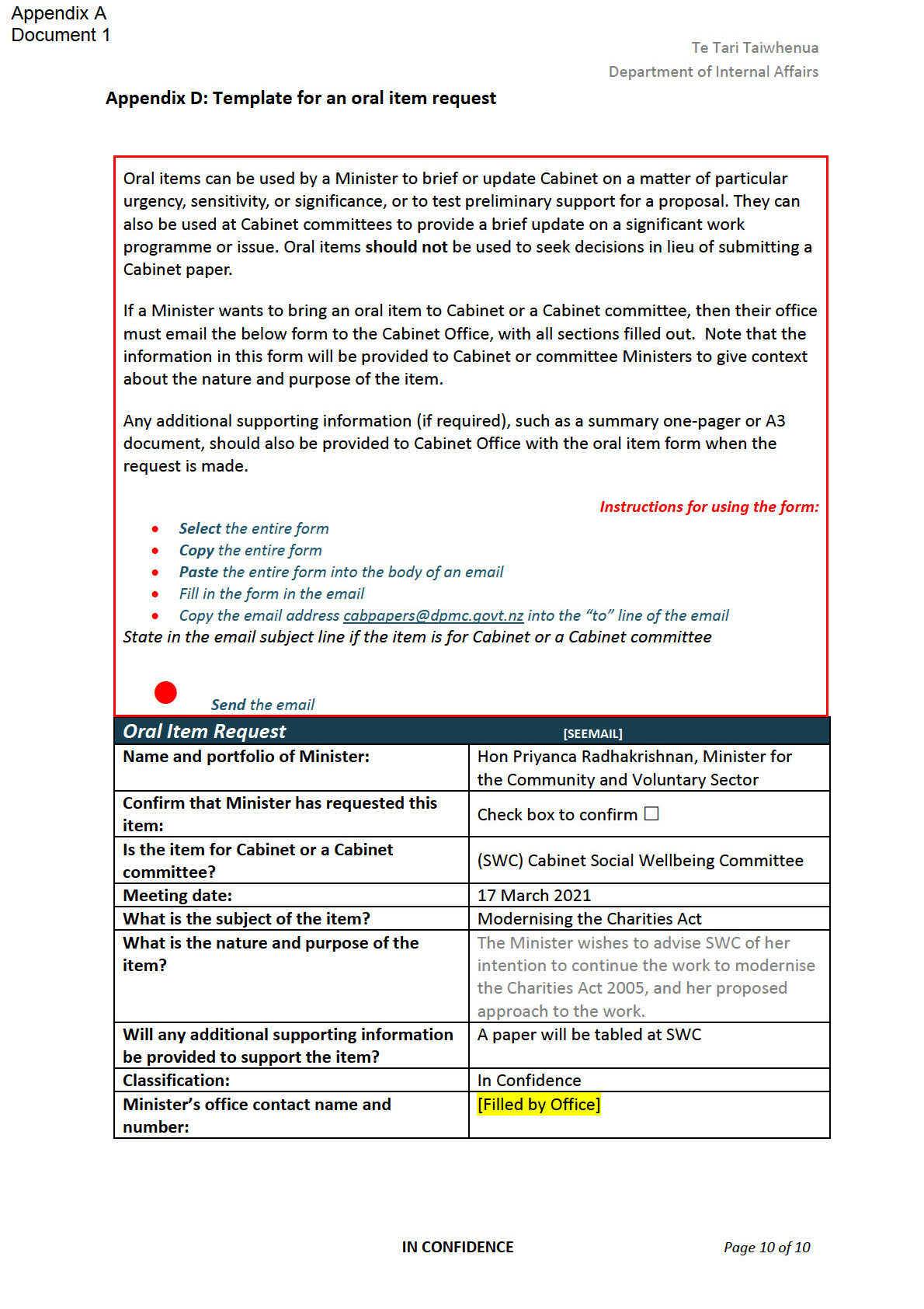 Cabinet Committee Oral Item Request Template in
