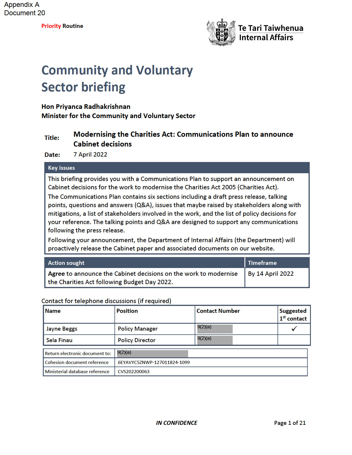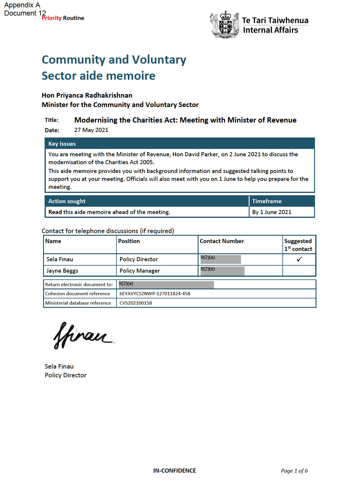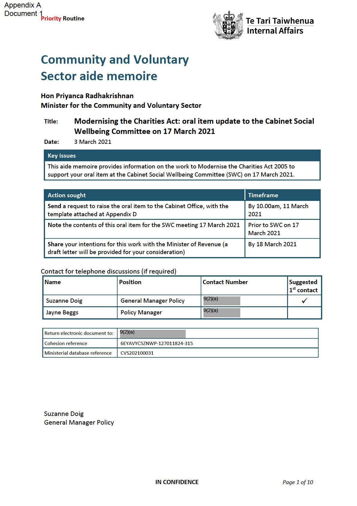 This aide memoire supports your oral item at the Cabinet Social Wellbeing Committee