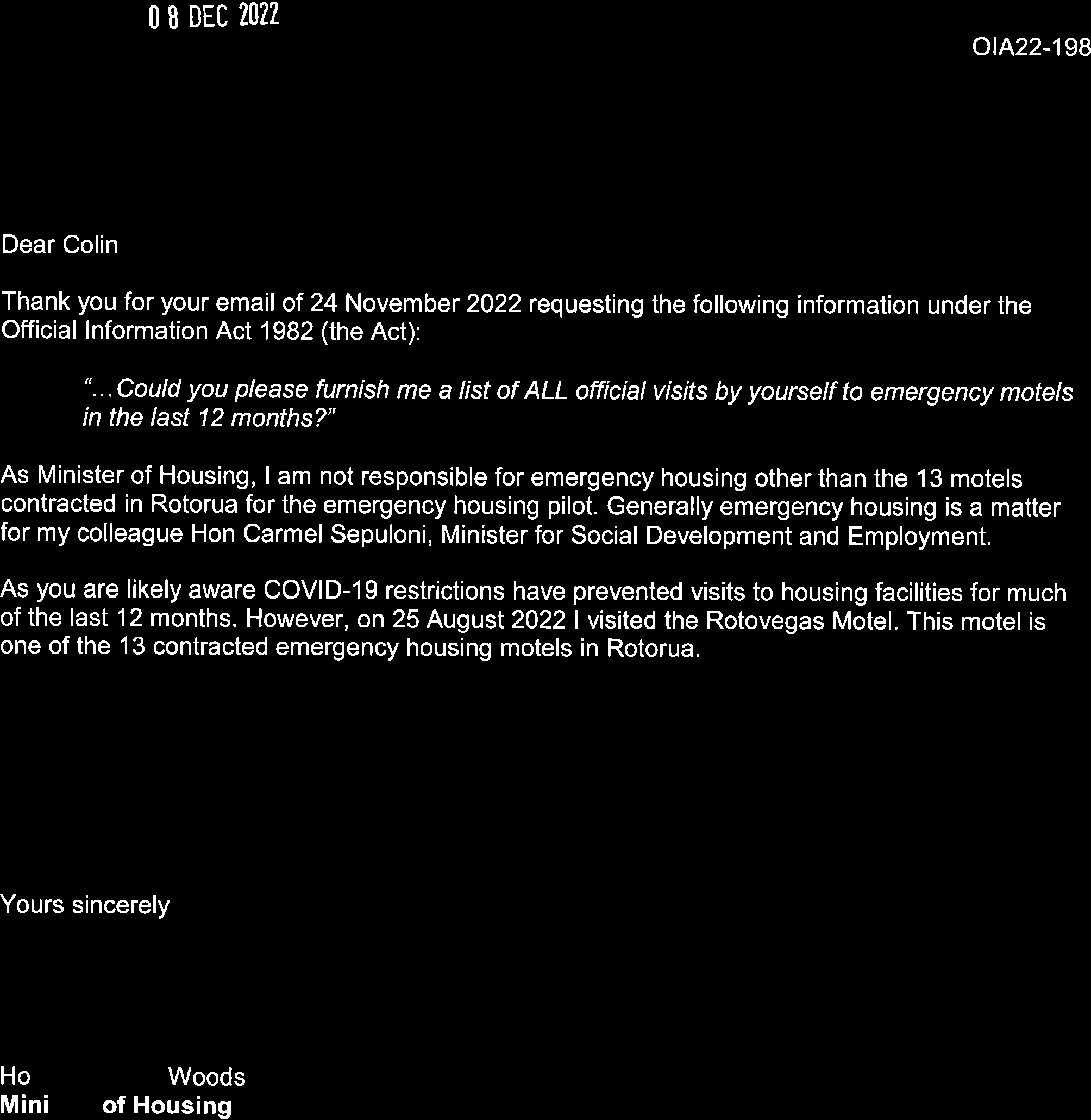 Visits to emergency motels by the Minister in the last 12 months.