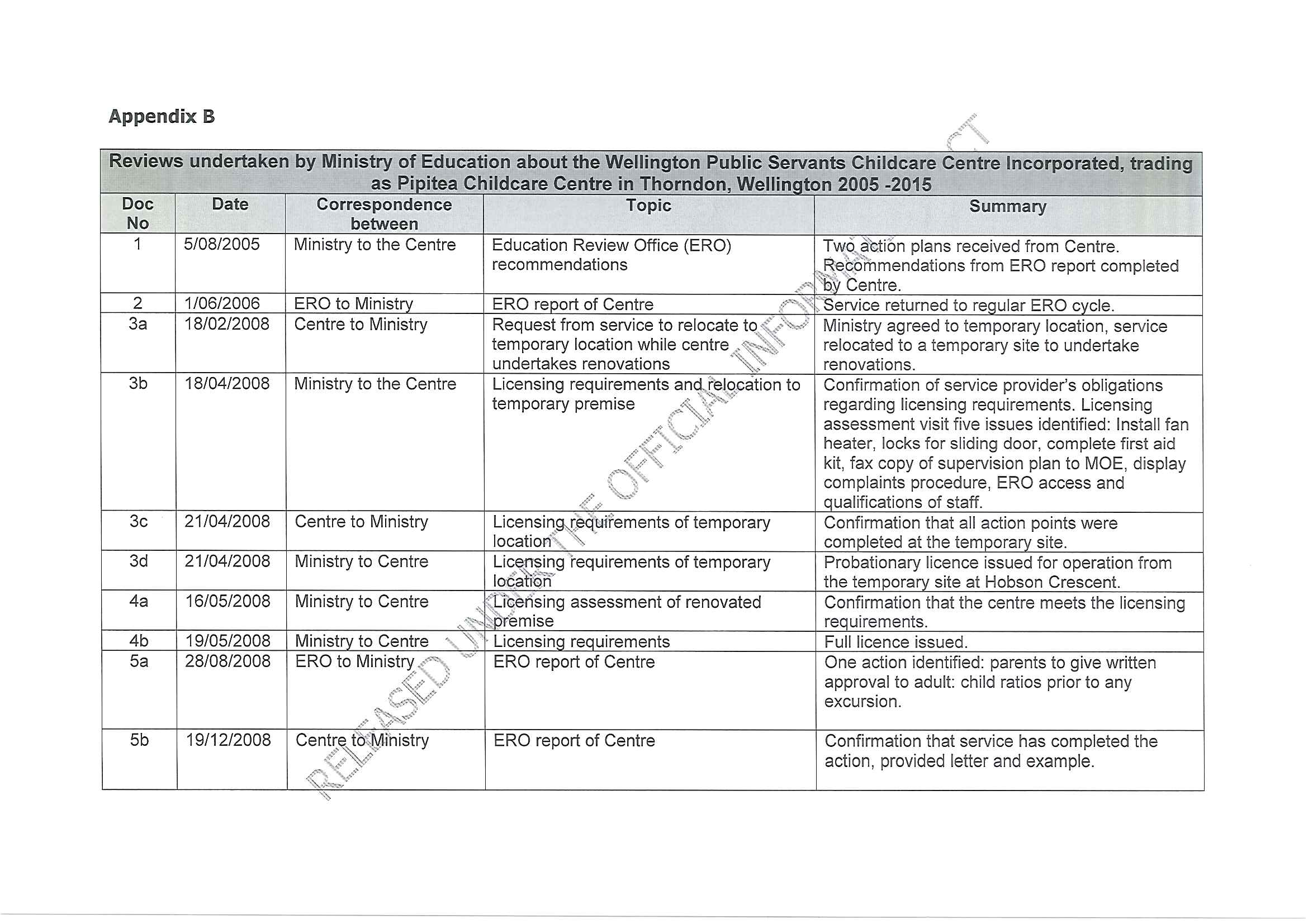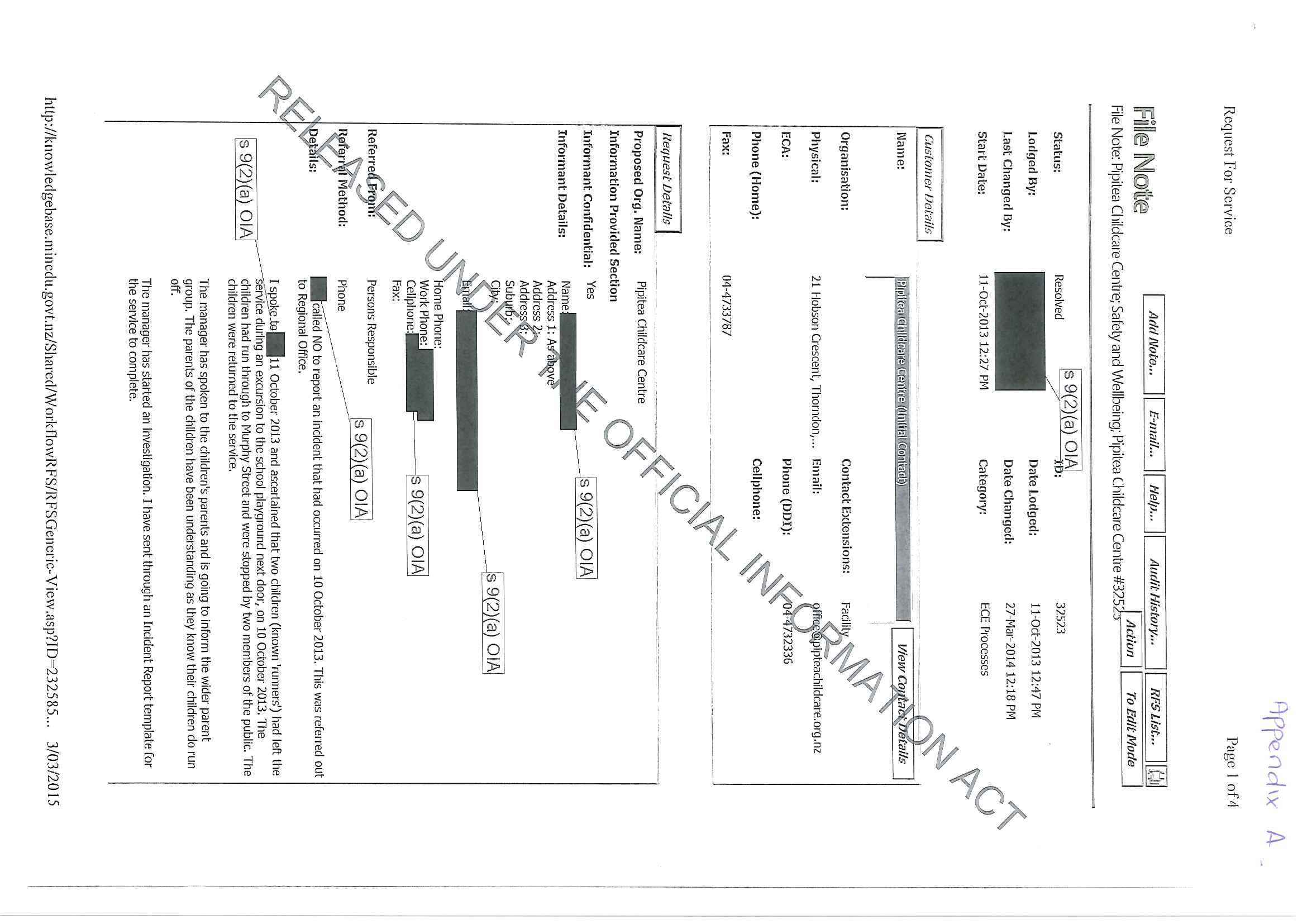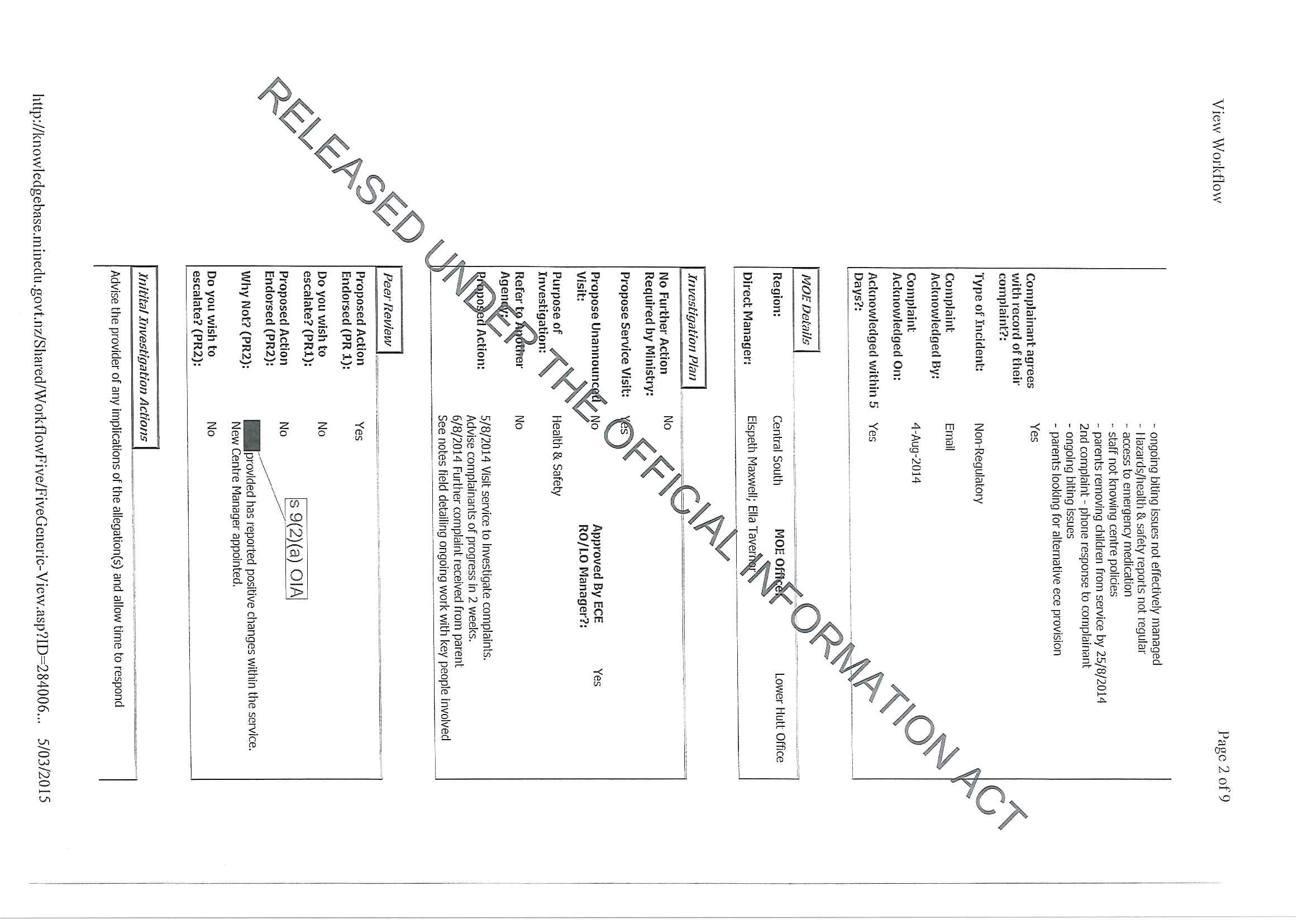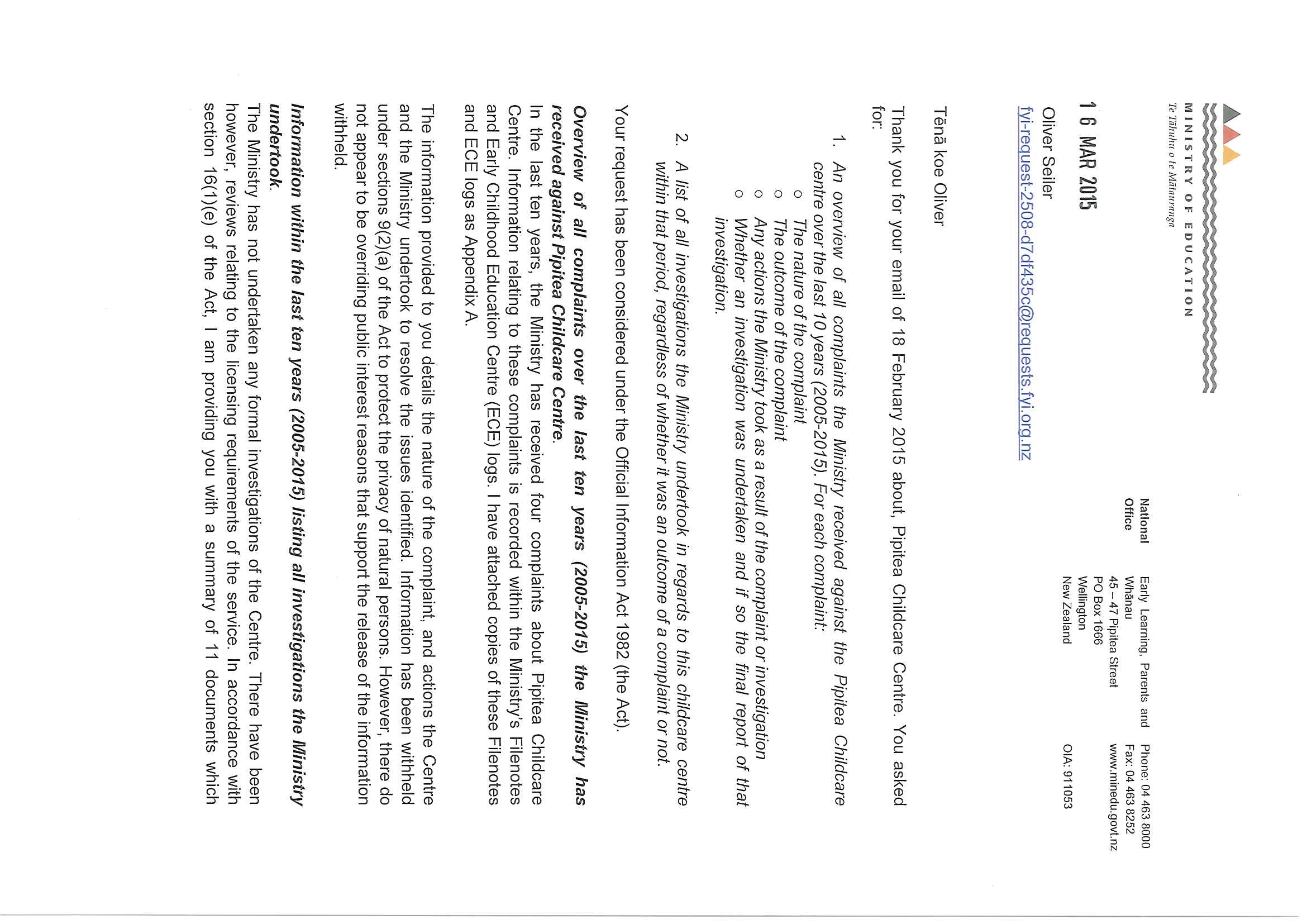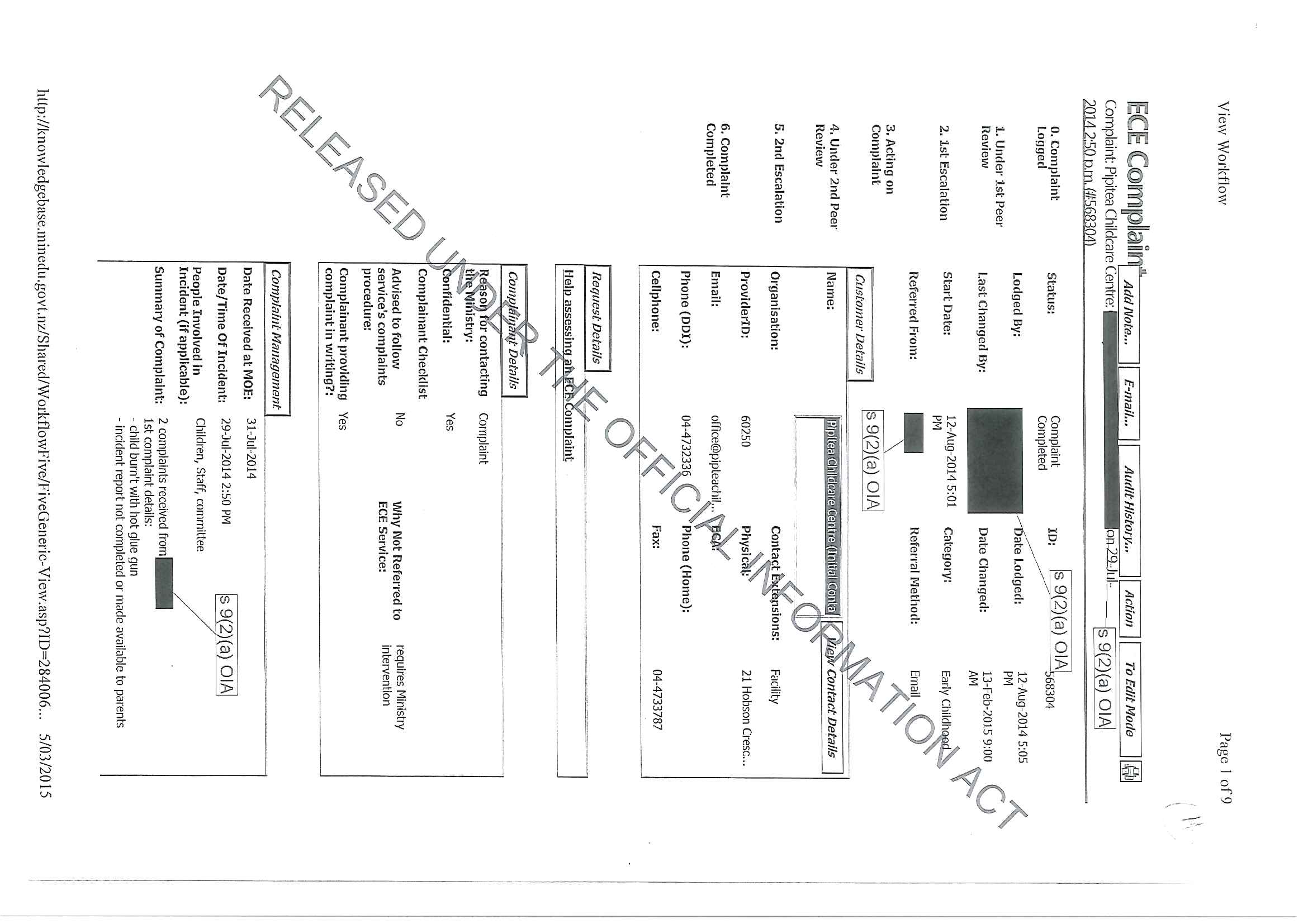 Complaints and investigations regarding Pipitea Childcare Centre