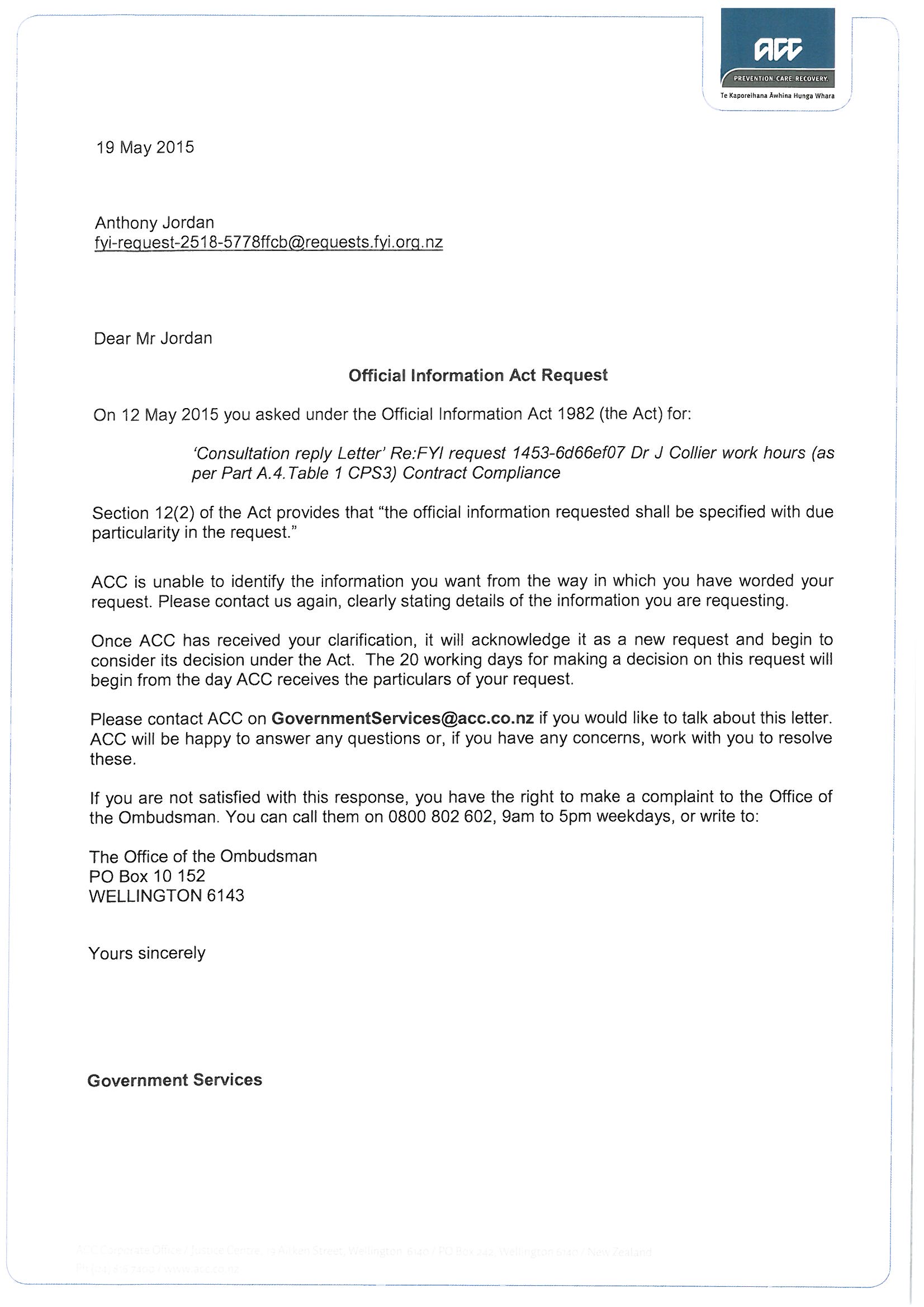 'Consultation reply Letter' Re:FYI request 1453-6d66ef07 Dr J Collier work hours (as per Part A.4.Table 1 CPS3) Contract Compliance