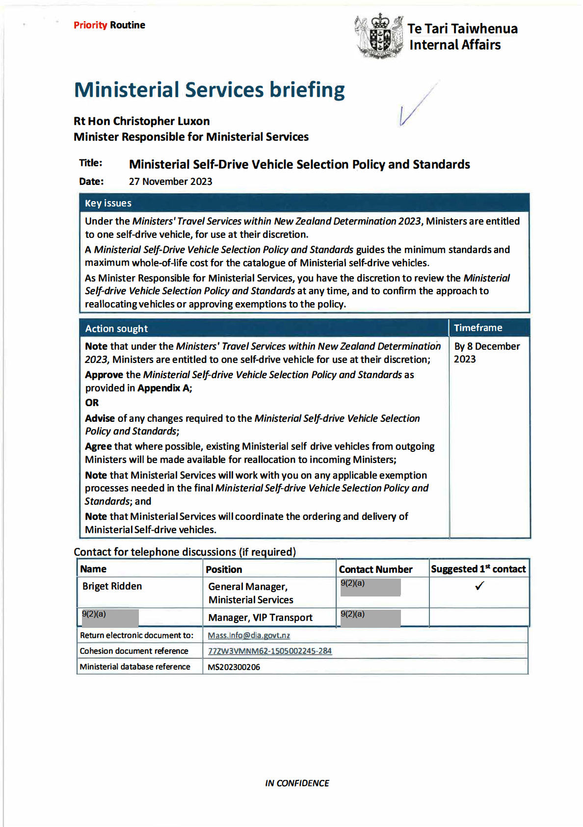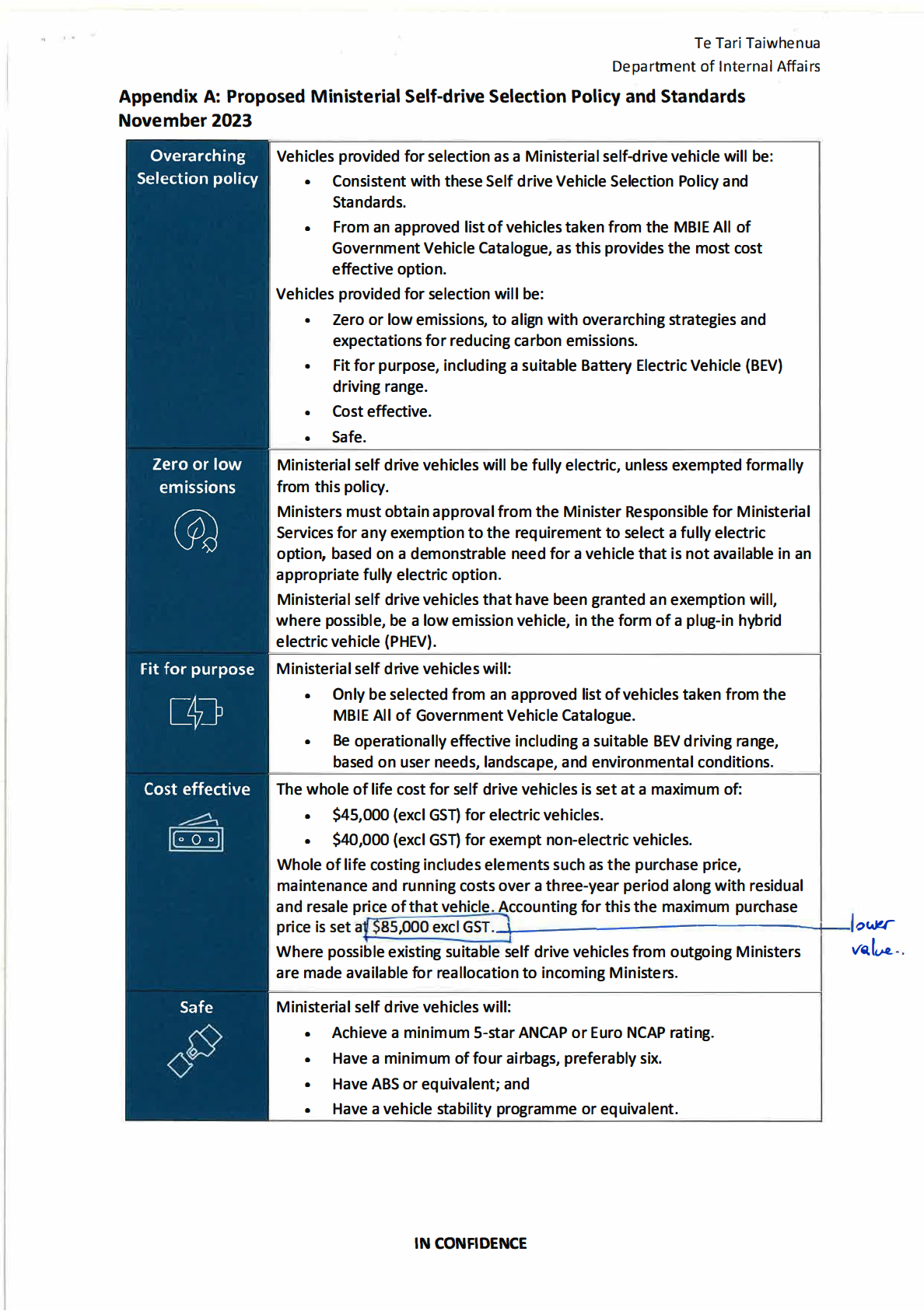 Self-drive Vehicle Selection Policy and Standards, prior to Ministerial Services