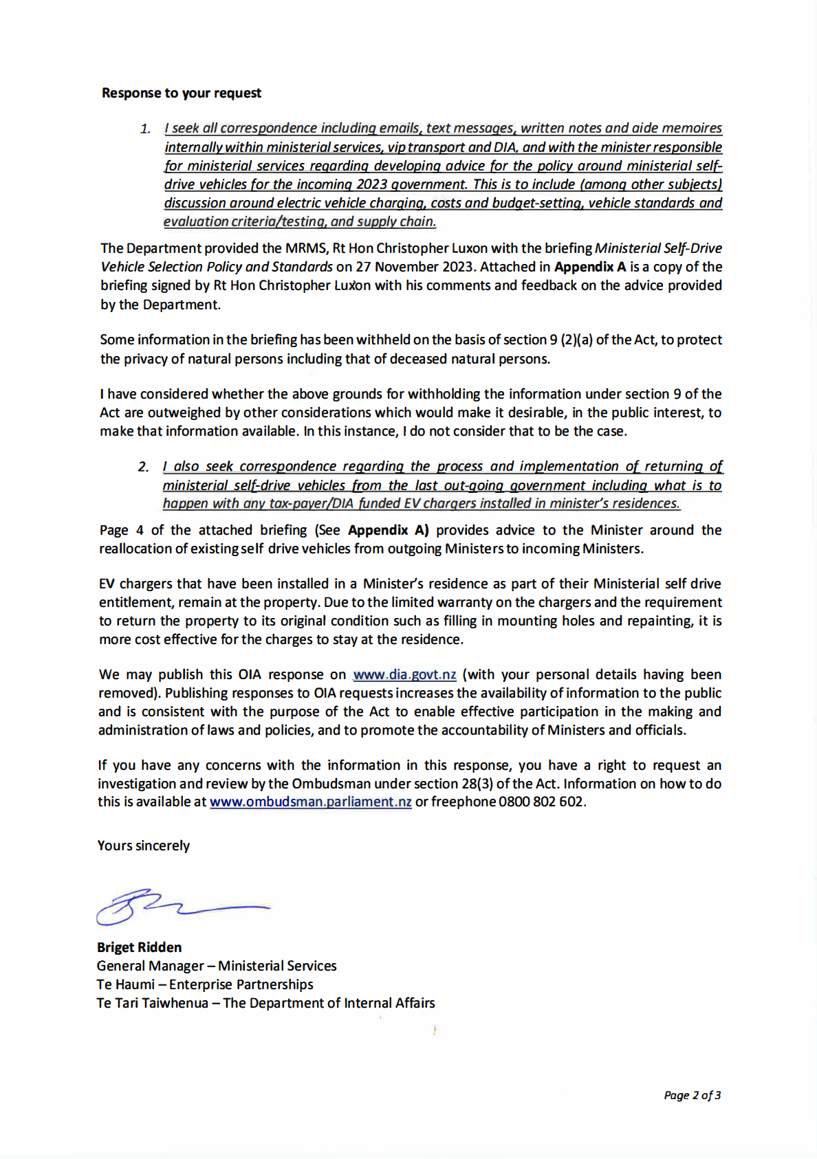 2 Note -where an electric vehicle is allocated or selected, the cost of equipping a Minister's private residence