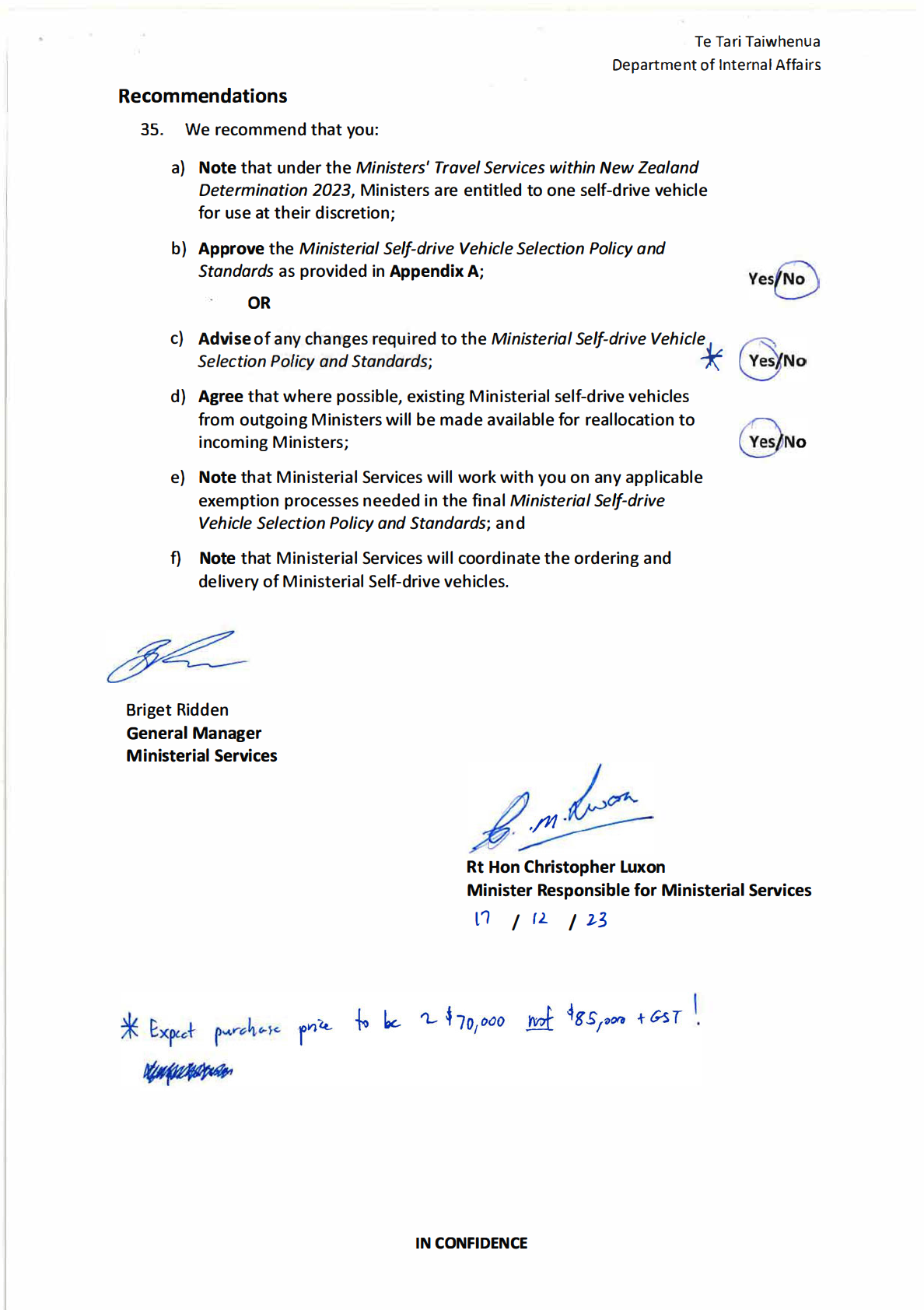 Ministers to finalise their Ministerial Self-drive vehicle entitlement.