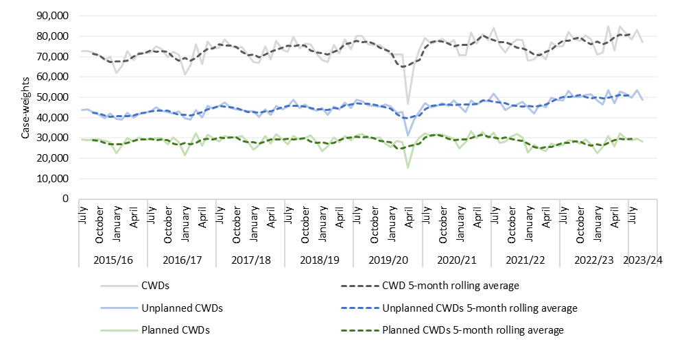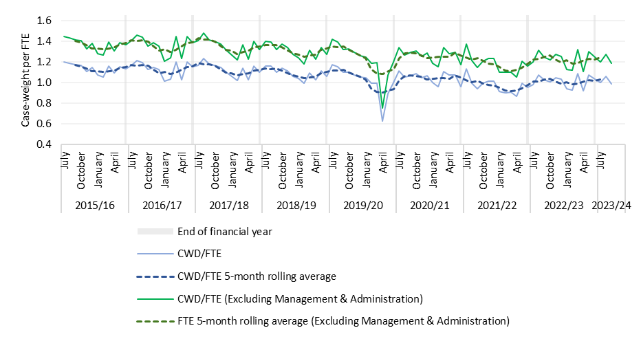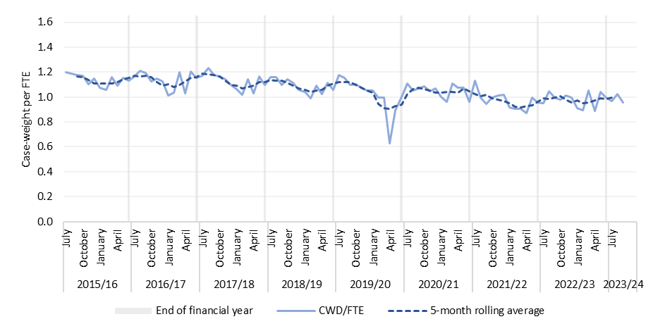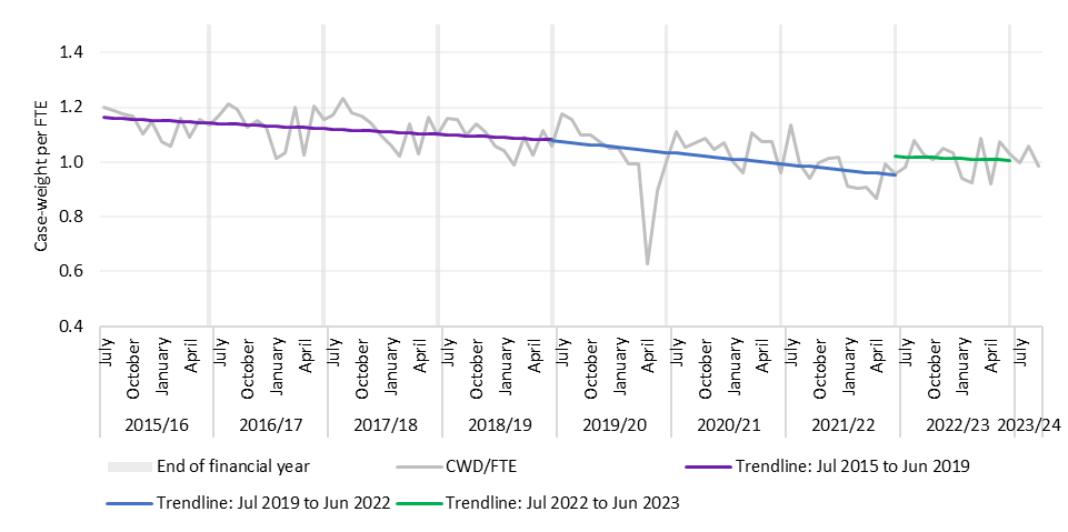 Figure 21: Case-weights per FTE, Nationally, July 2015 – September 2023