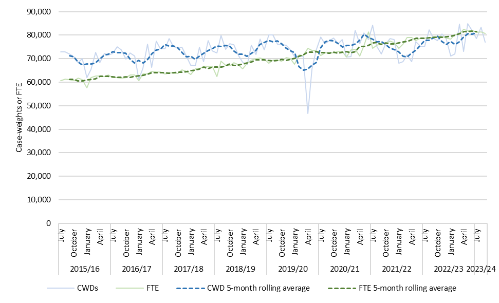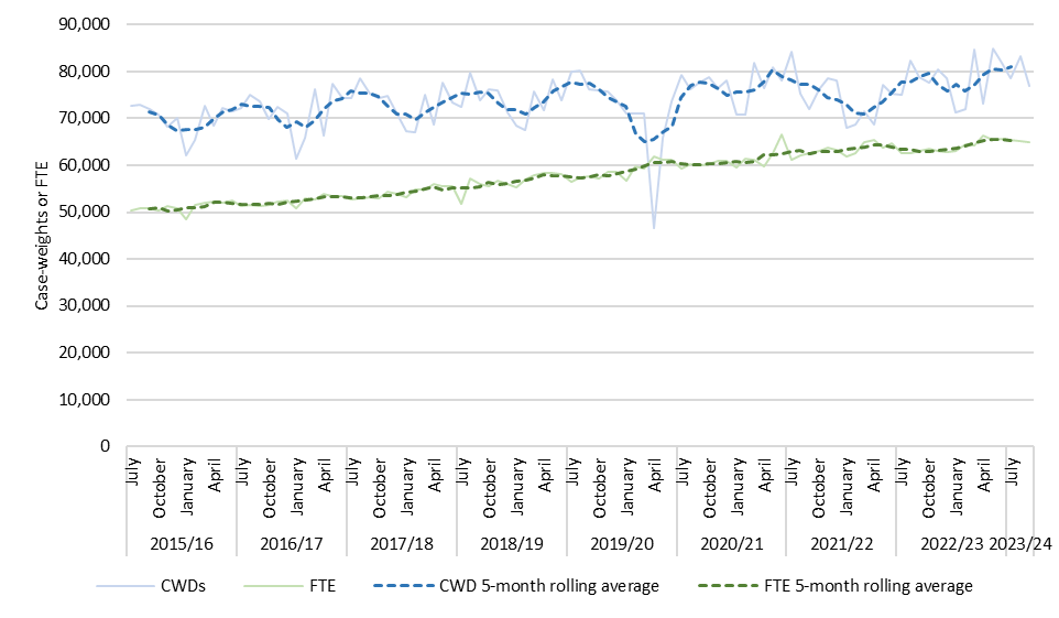 Figure 23: Case-weights and FTE, Nationally, July 2015 – September 2023