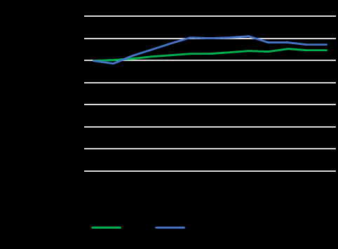 Total FTE (inputs) have increased at nearly 2.5 times the rate of case-weights (outputs) so even though