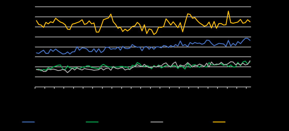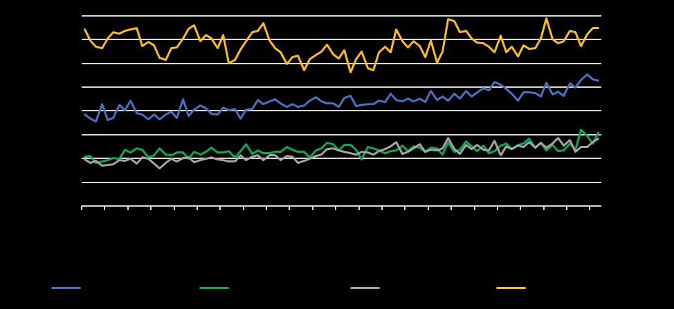 trendlines as the trendlines only go to June 2023. Axis has been truncated to start at 0.4 Case-weight/FTE.