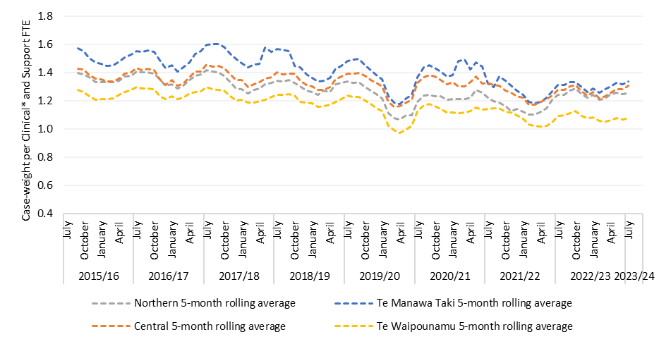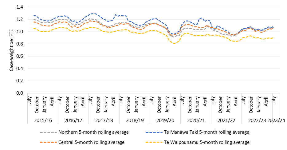 Figure 24: 5-month rolling average Case-weights per FTE, by region, July 2015 – September 2023