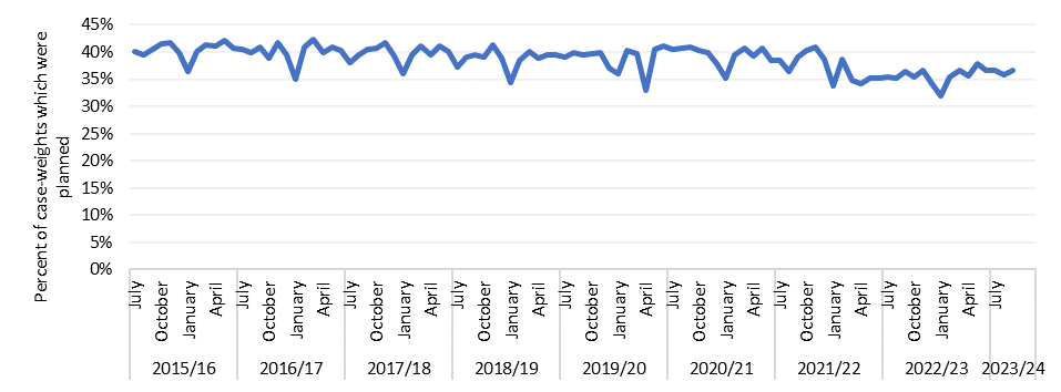 increase of 27.9%. Over the same time, the sum of case-weights (annually from July - June) has increased