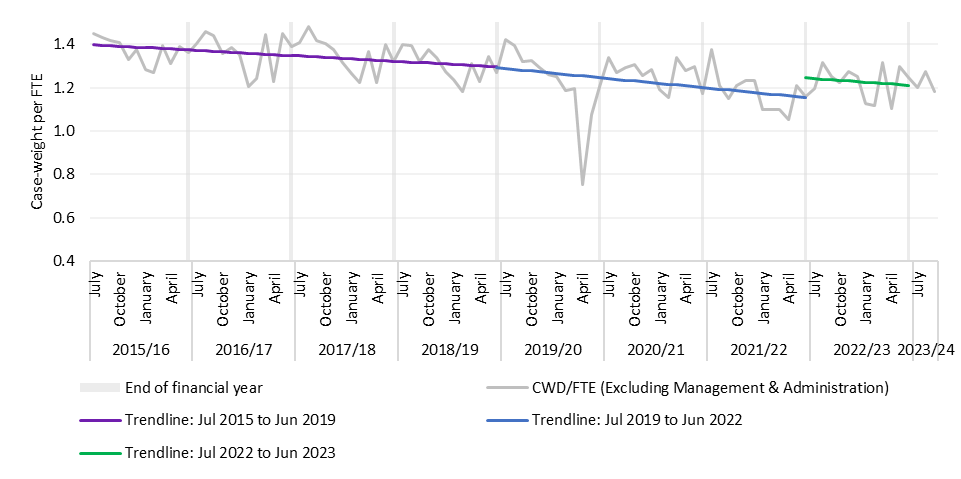Case-weights per Clinical and Support FTE trended down between 2015/16 and 2022/23, from an average
