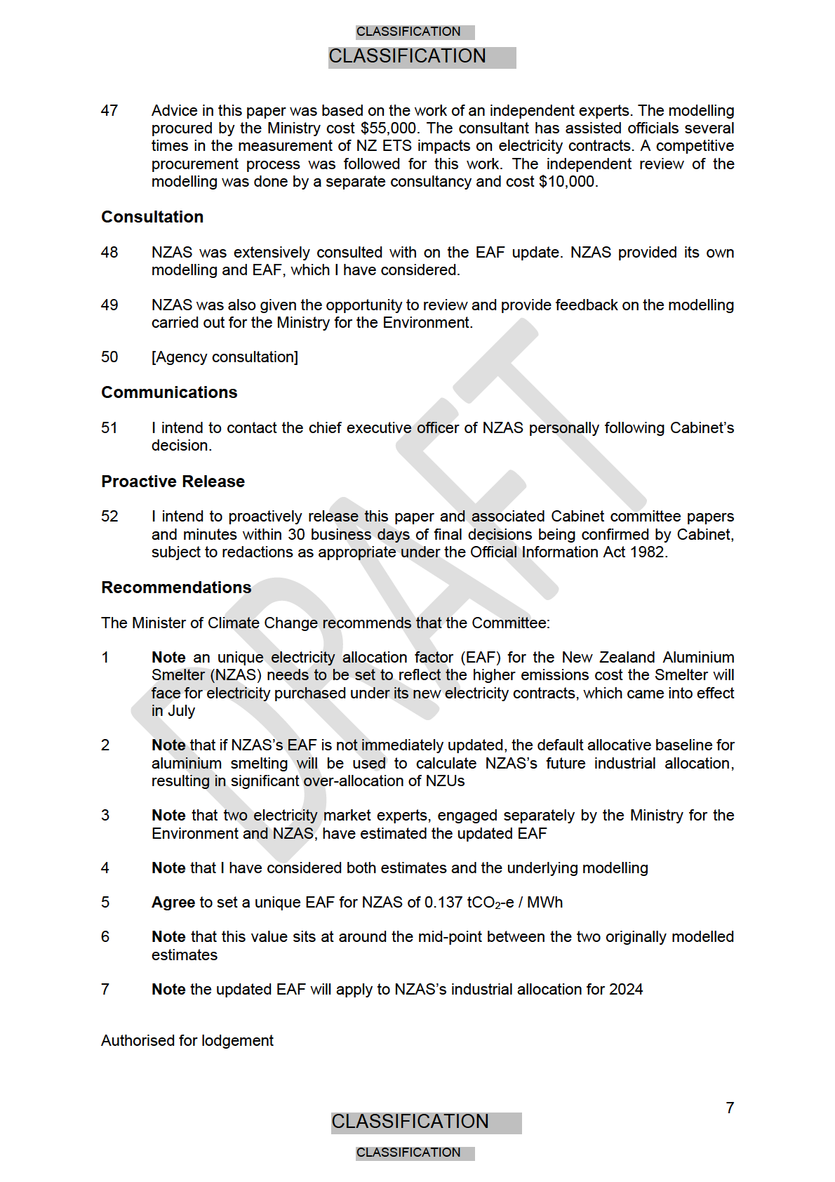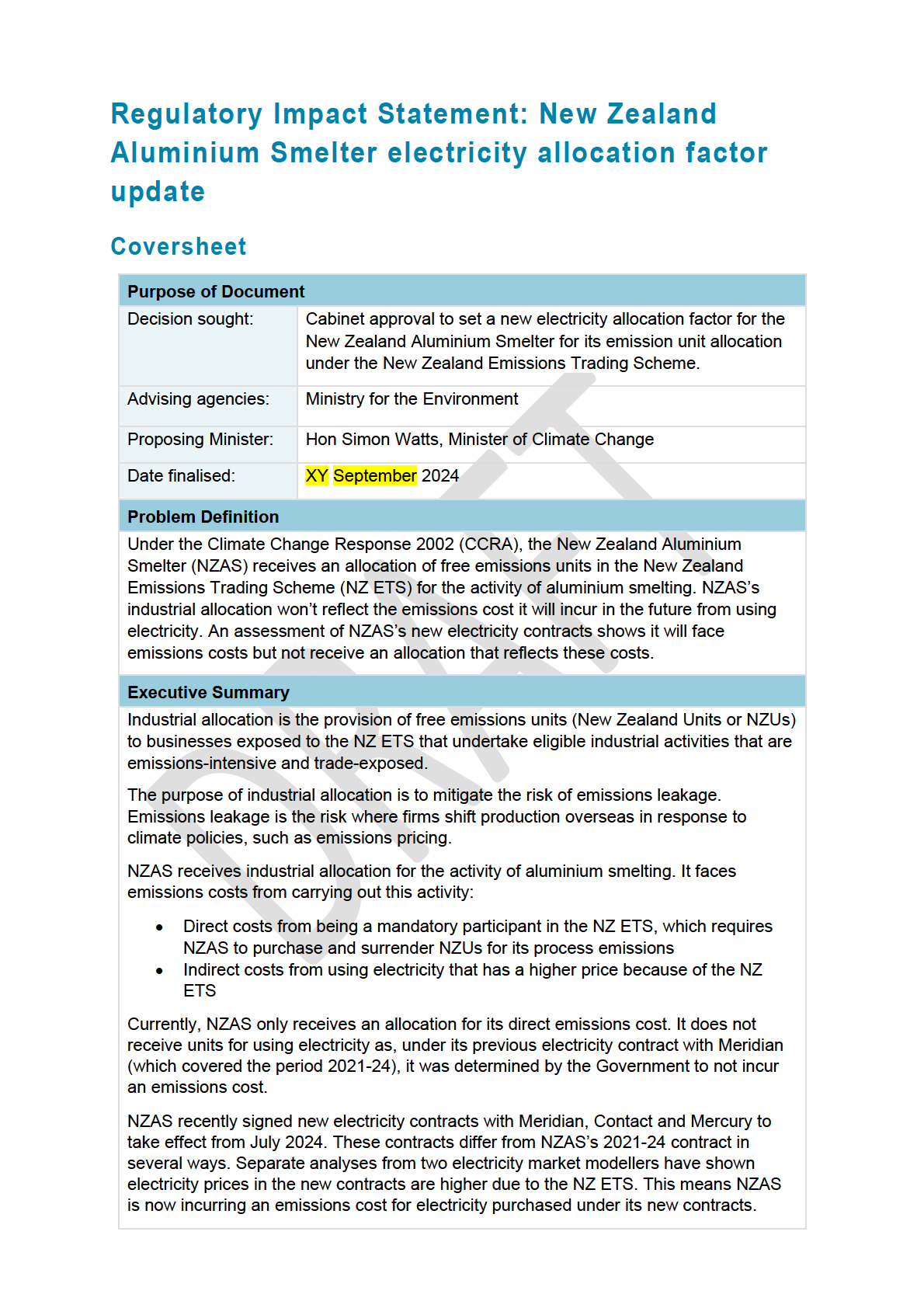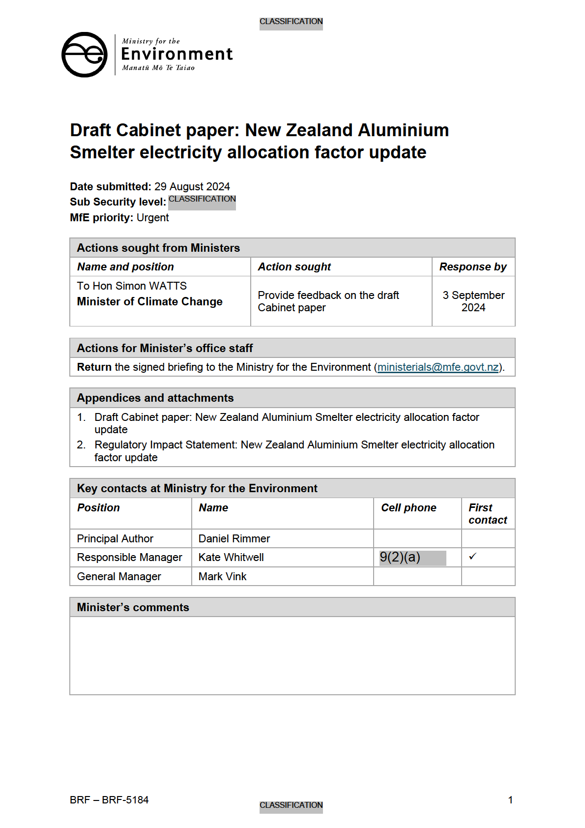 provide feedback on the attached draft Cabinet paper: New Zealand Aluminium Smelter