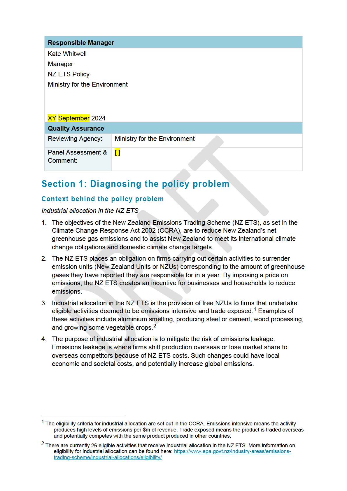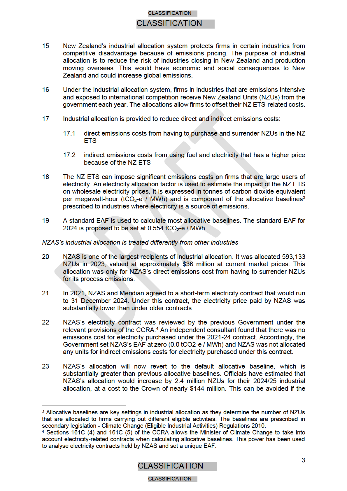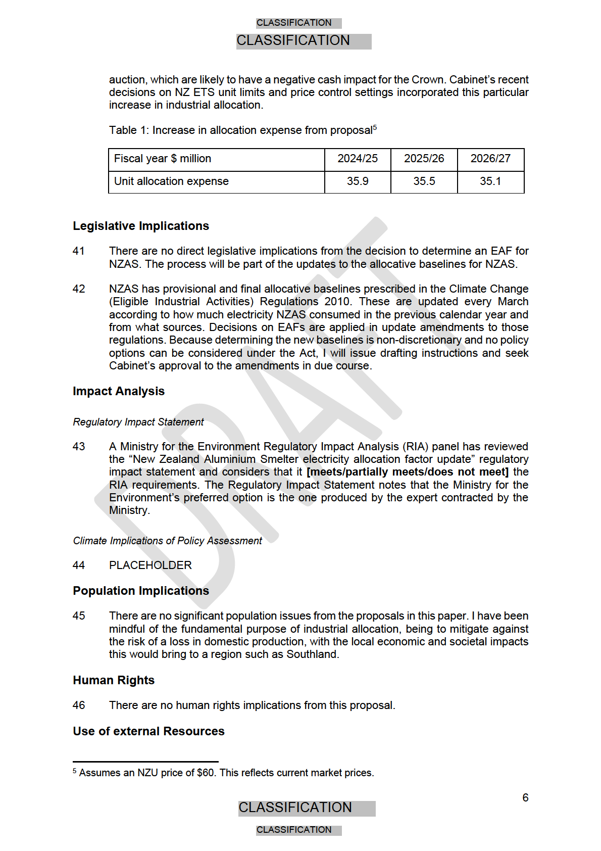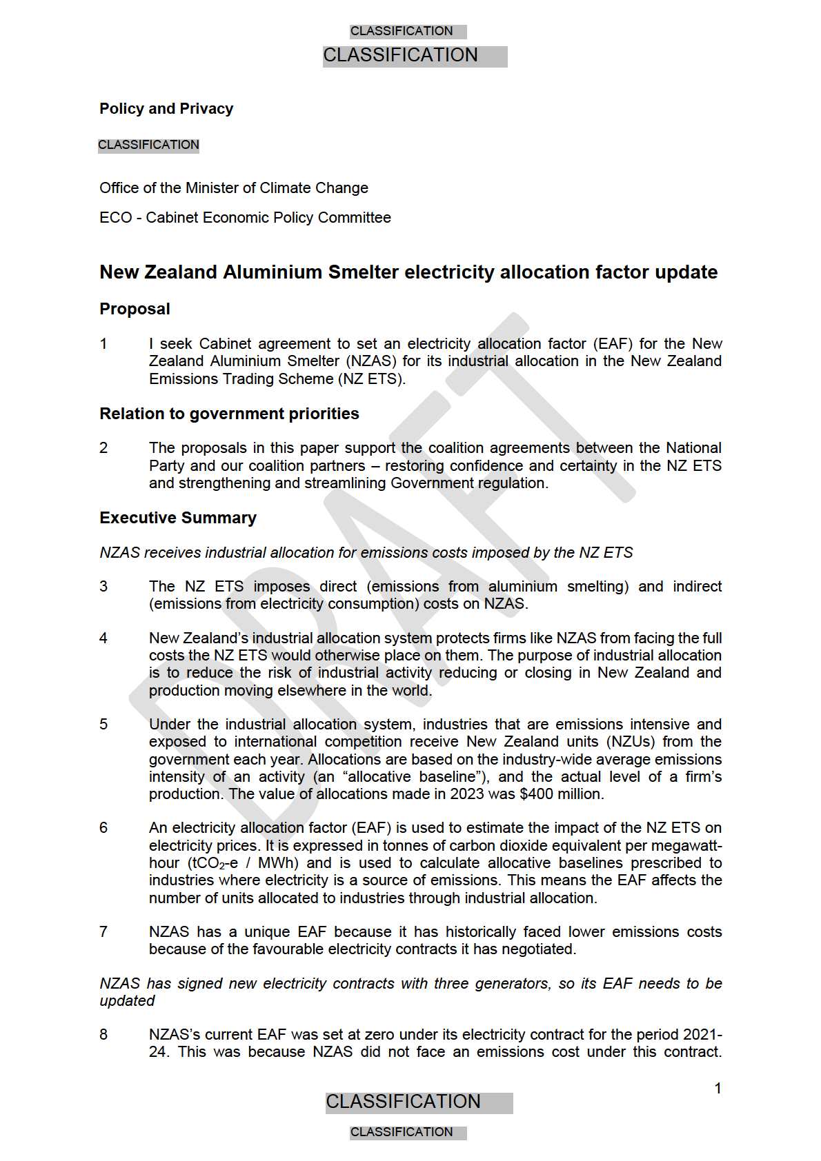 provide feedback on the attached draft Cabinet paper: New Zealand Aluminium Smelter