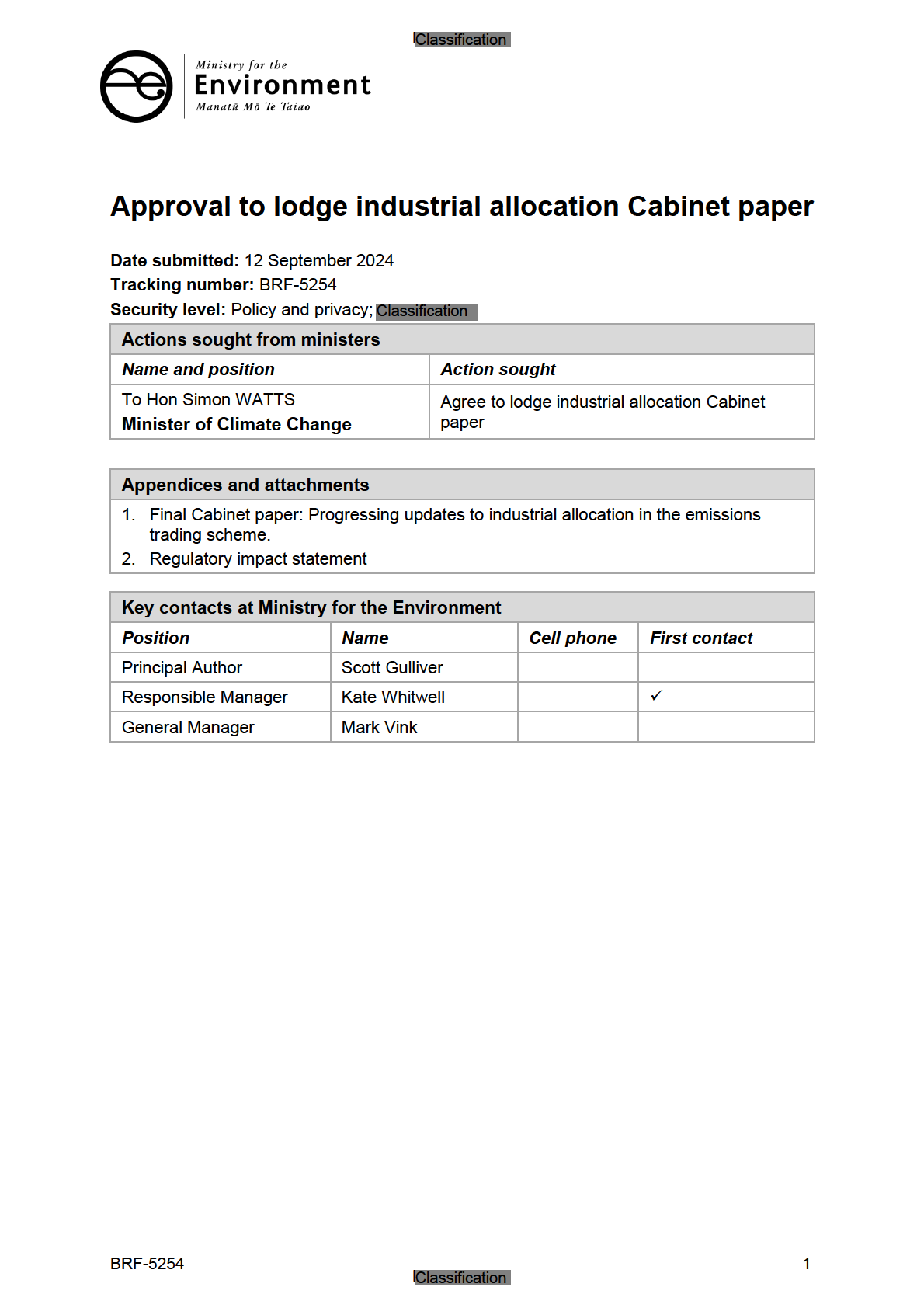 1. We seek your approval to lodge the attached Cabinet paper and its regulatory impact