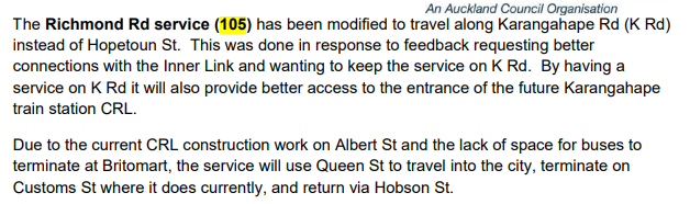 Central Suburbs New Network summary report Auckland Transport (AT) discusses the 105 route, but