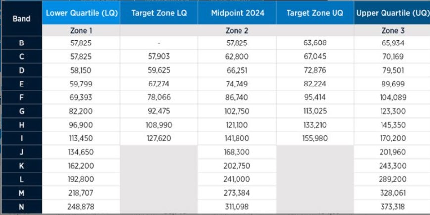Please provide the current salary bands and respective salary ranges at Auckland Transport for 2025.