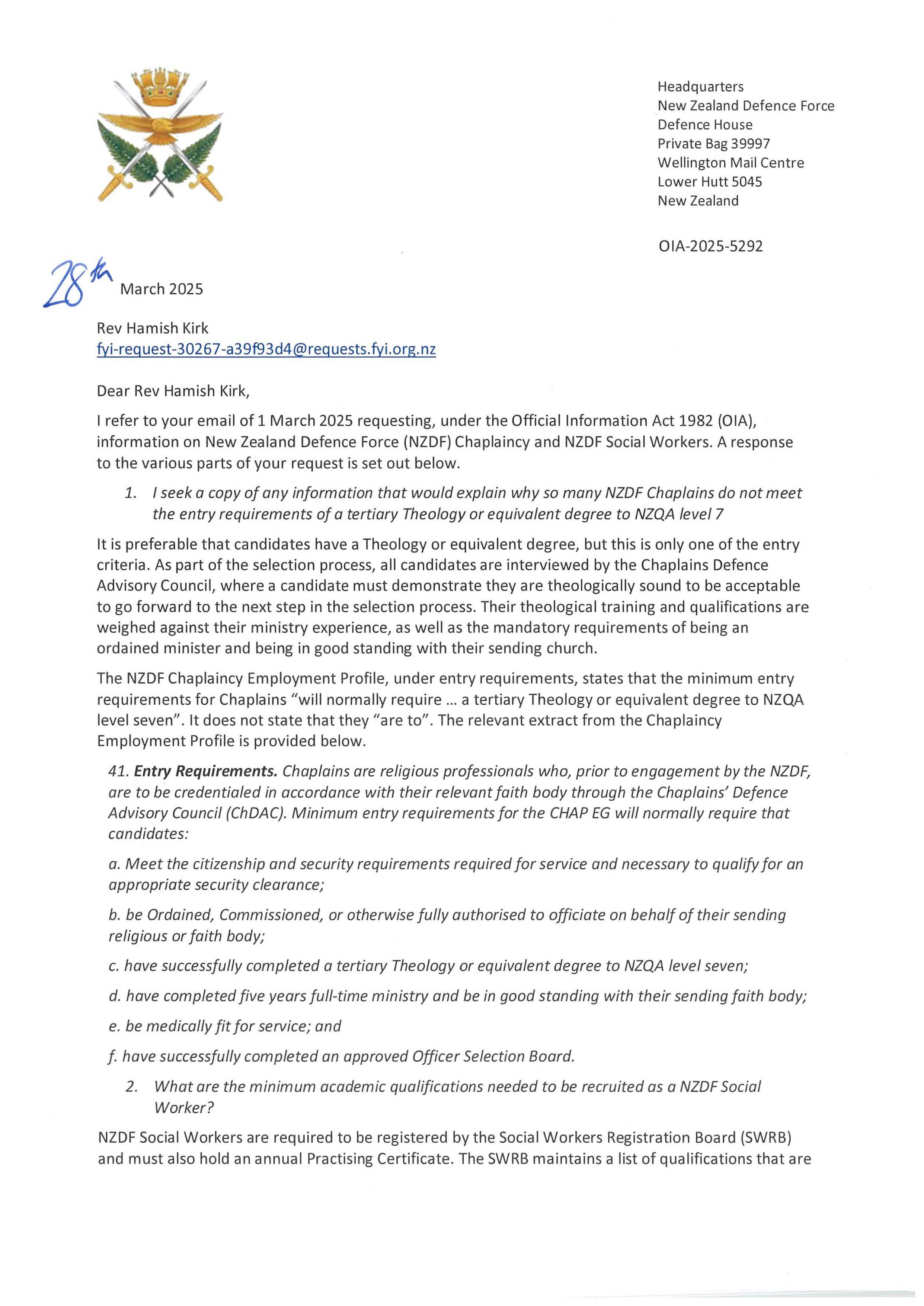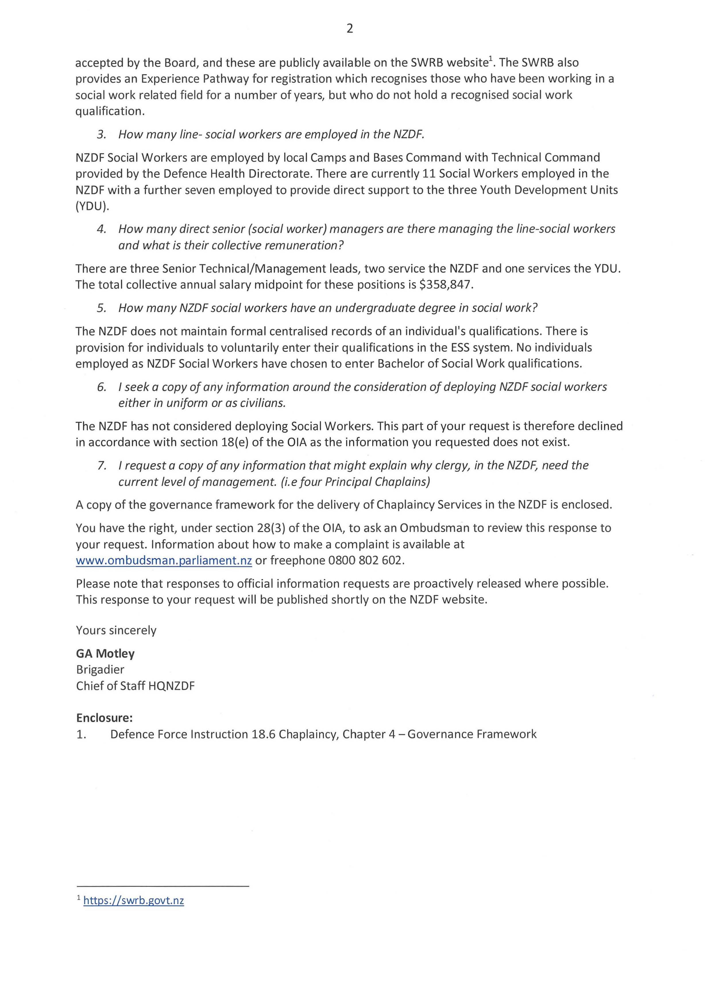 NZDF Chaplain and Social Workers minimum academic qualifications and leadership costings.