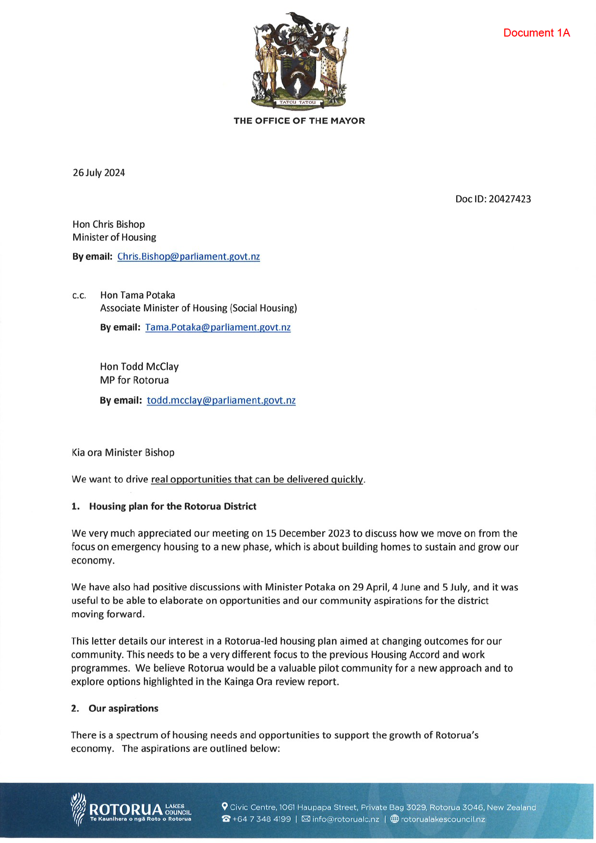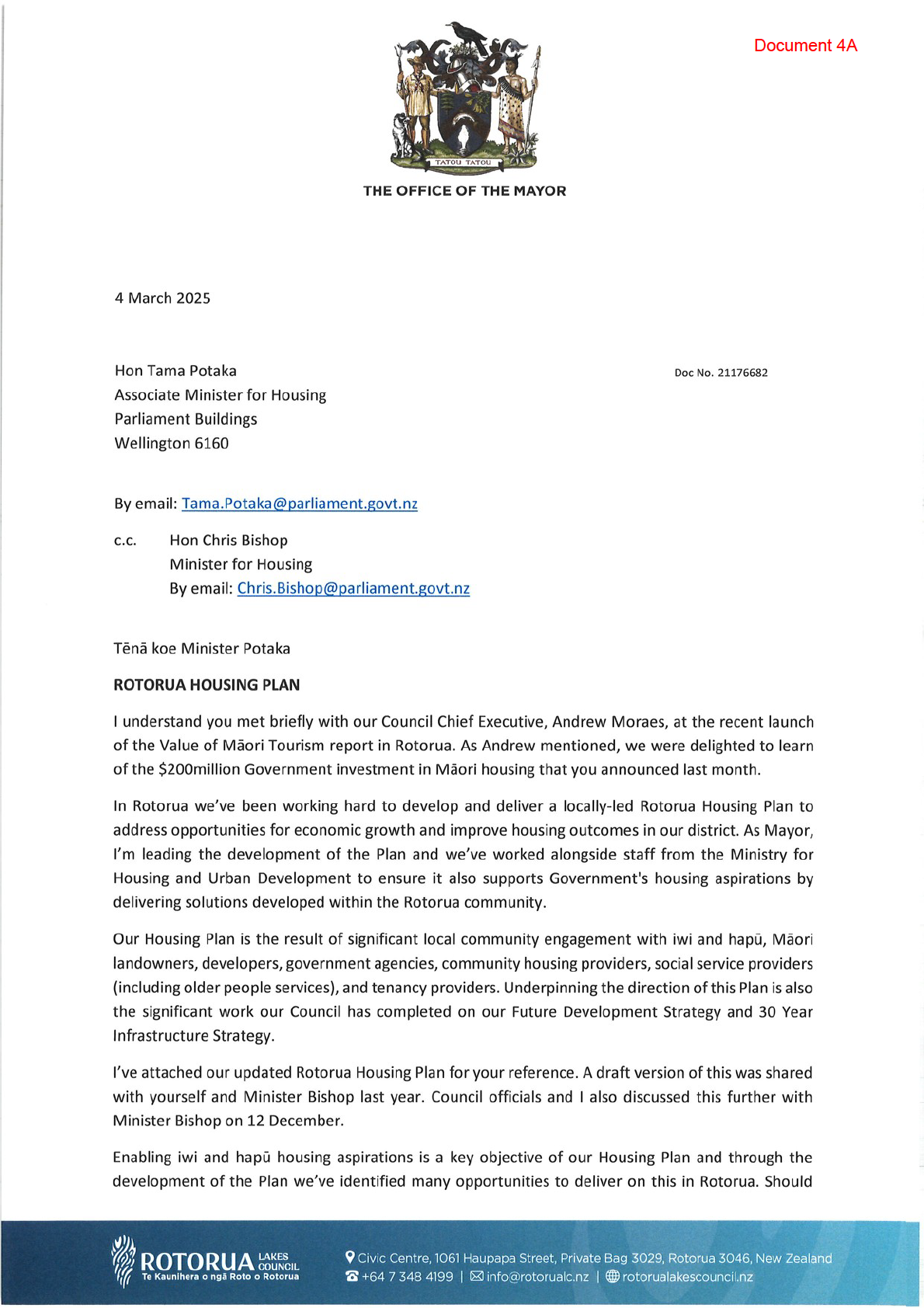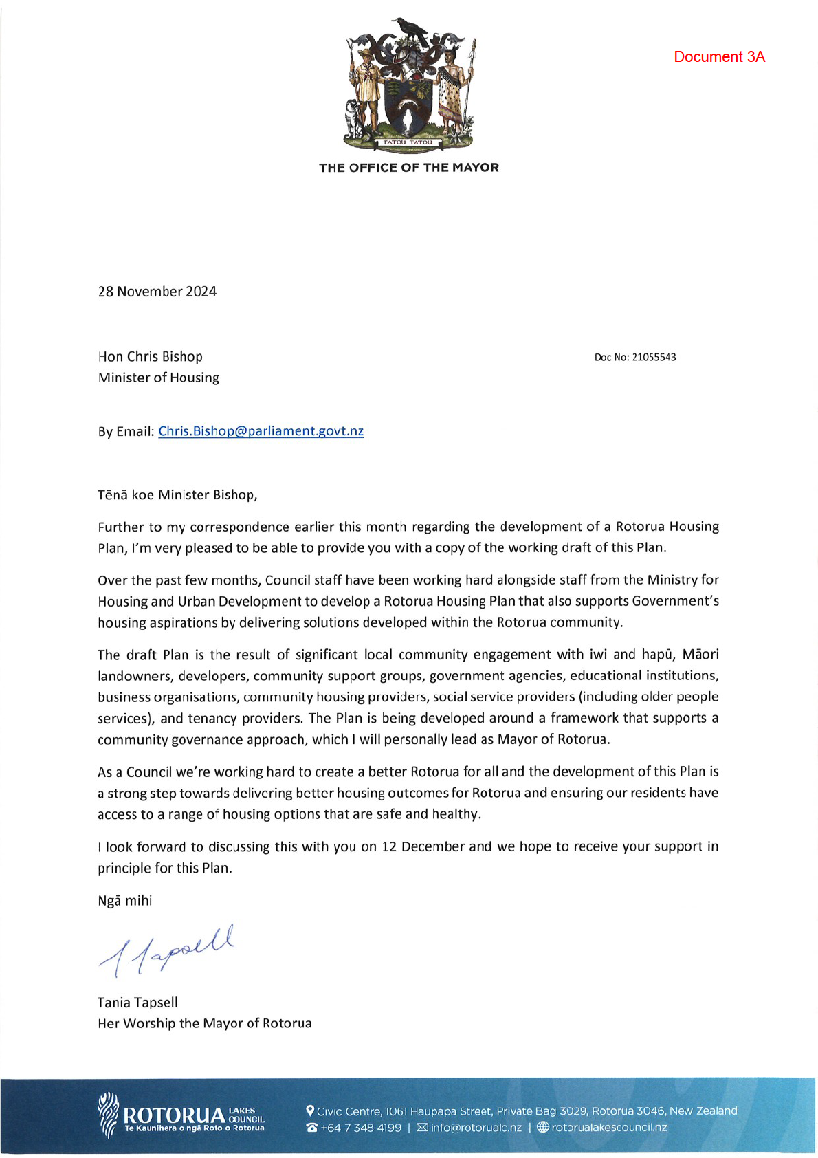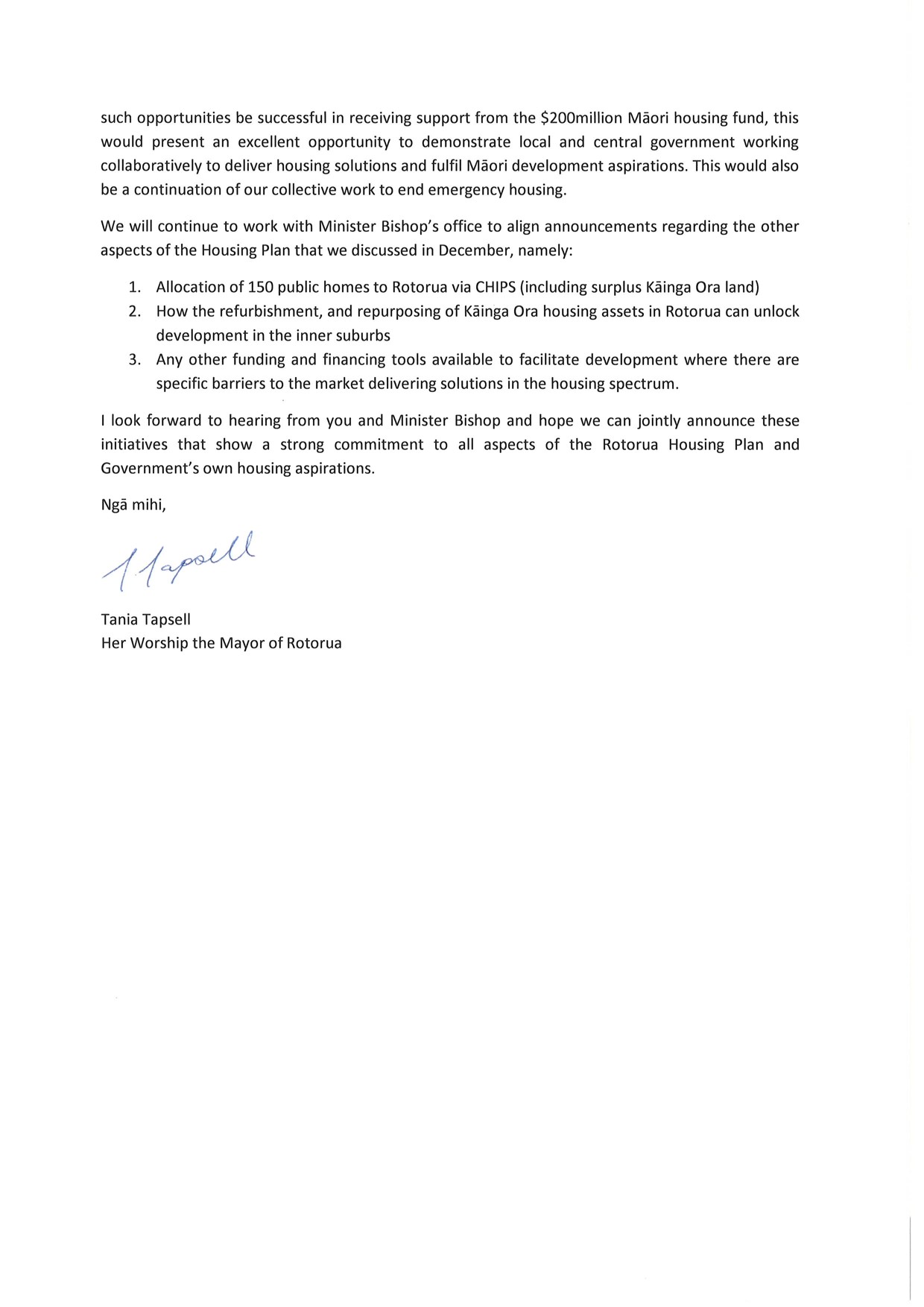 CORTP-1646: Letter from Mayor Tapsell re; Housing Plan for Rotorua District