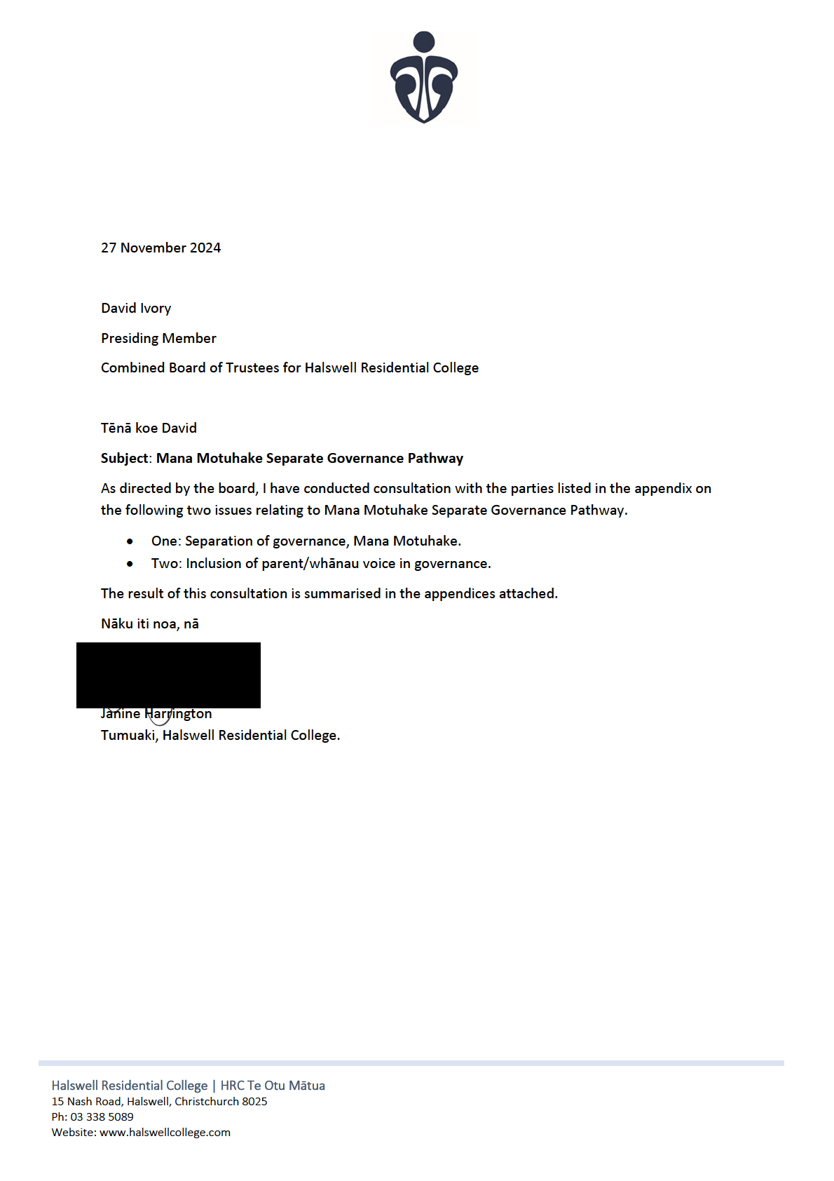 • Principal’s Letter re Mana Motuhake Separate Governance Pathways: Consultation and responses